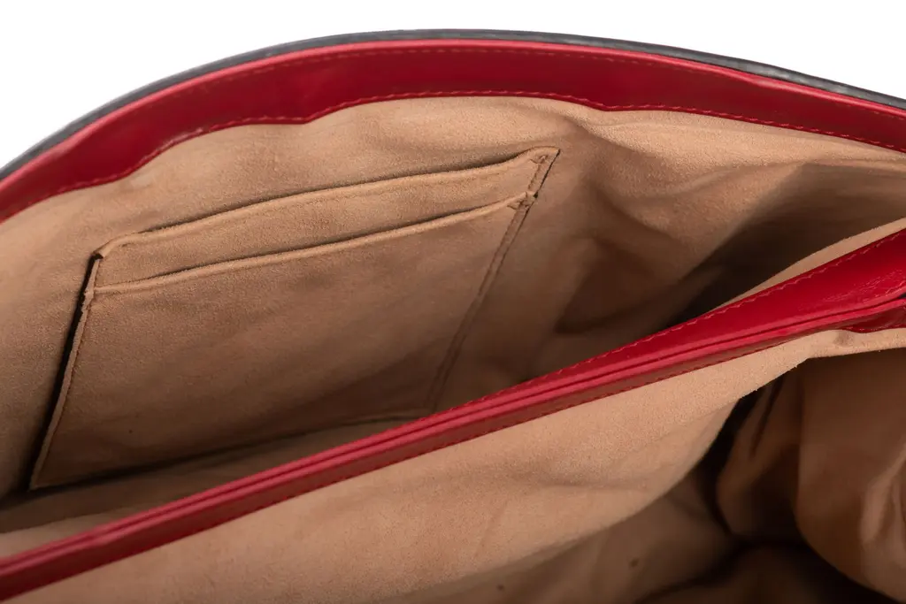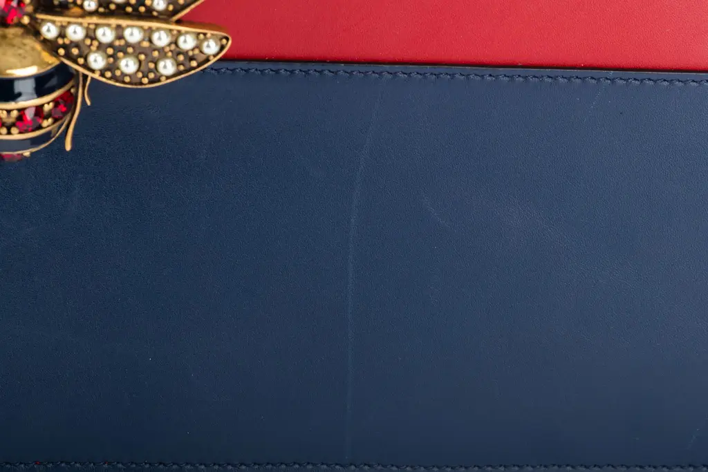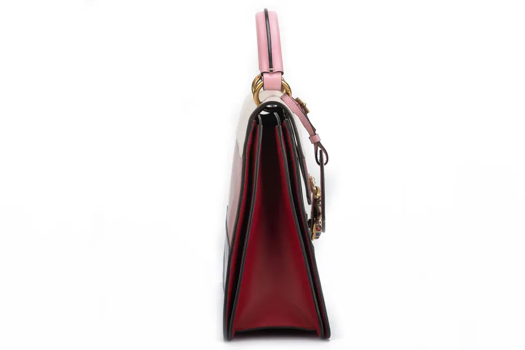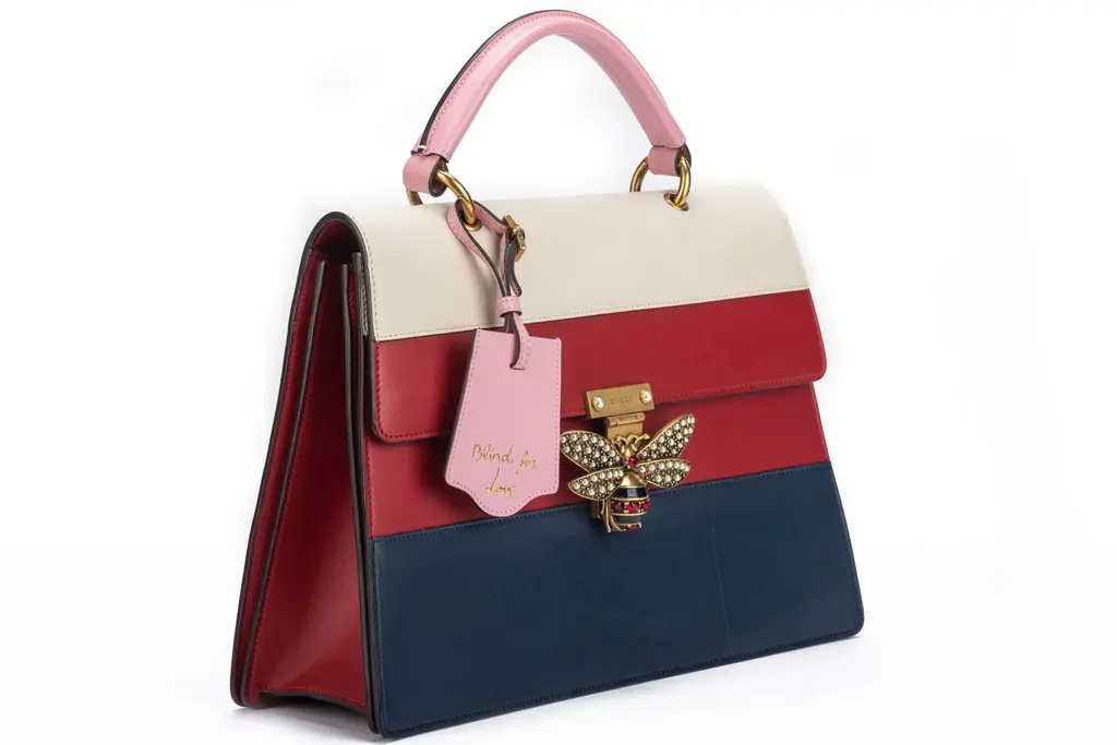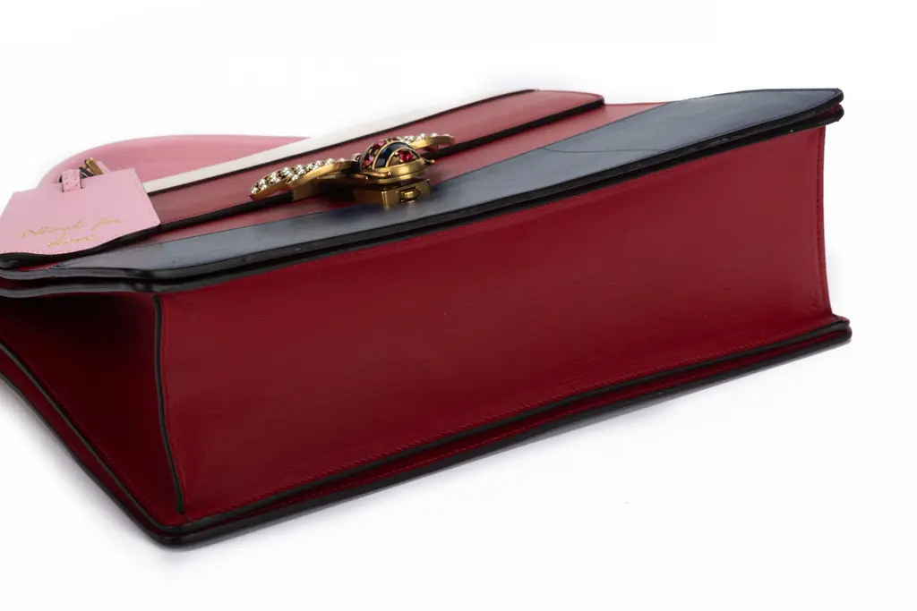 Gucci preloved in excellent condition large trapeze striped bag with bee jewel caps. Blue , pink, white and burgundy striped leather. Name tag and detachable shoulder strap. SHoulder drop 19.5�����. Comes with generic dust cover.