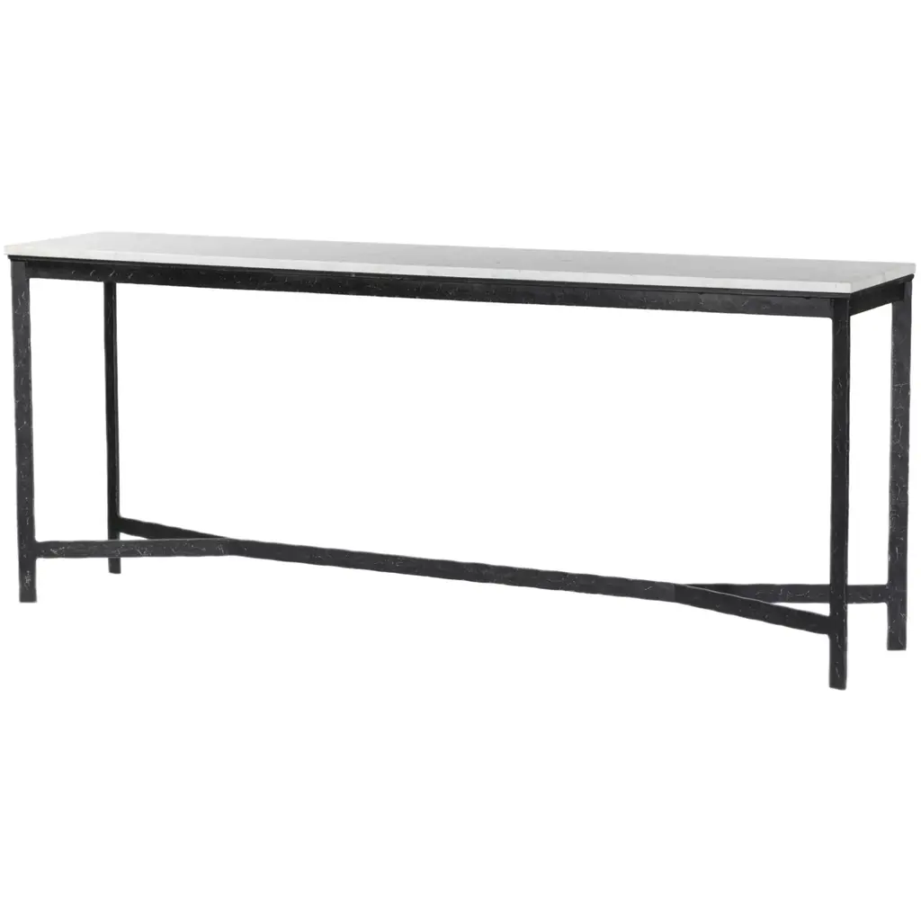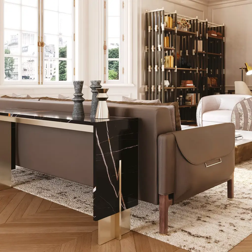 A captivating design of refined and minimalist architectural essence, this console will make for a precious accent to an entryway or living room decor. It features a champagne-finished metal structure, with a black Marquina marble top also covering the sides, the latter enriched with metal inserts. Please consult the Concierge for further details.