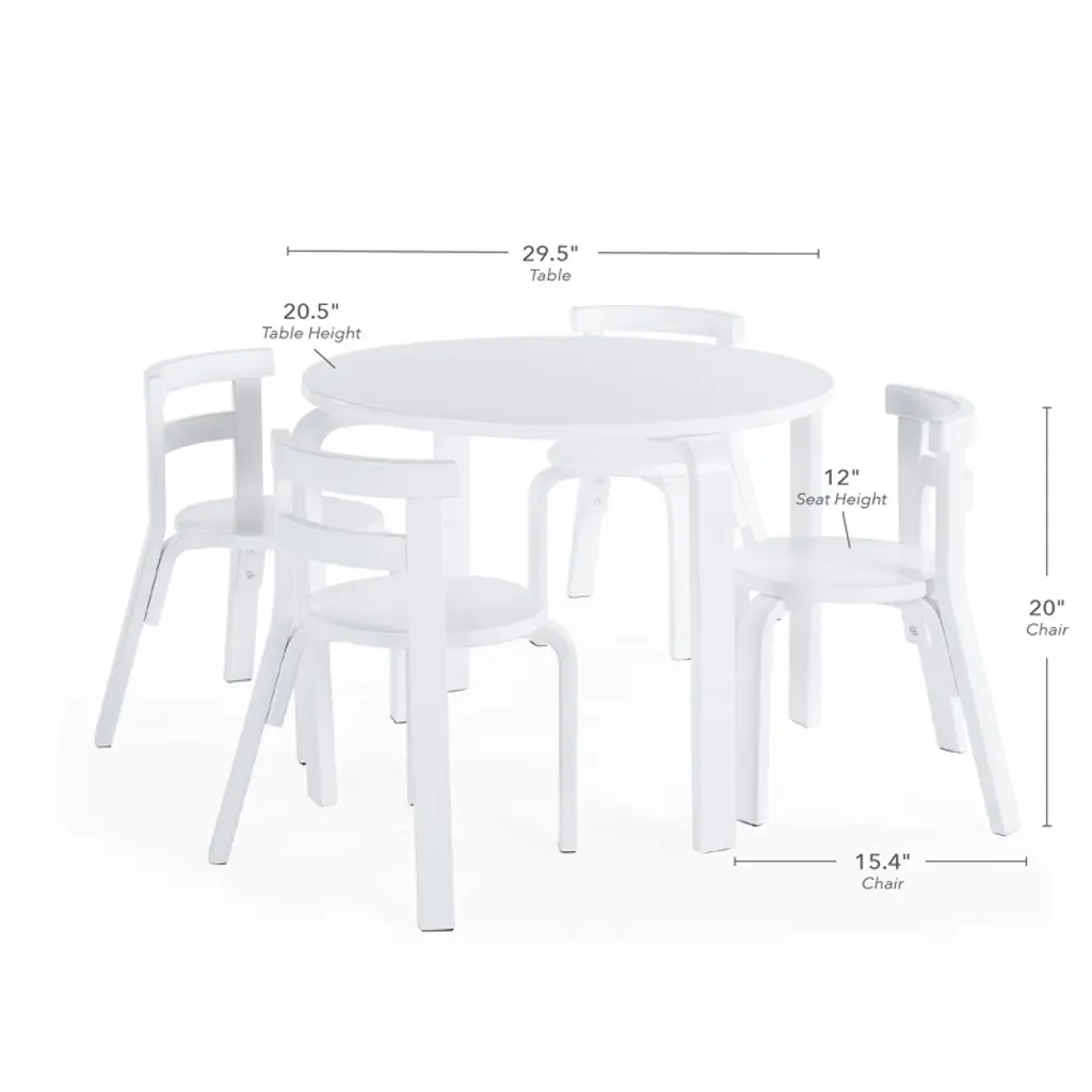Whether it is snack time, story hour, or an art session, the Nordic Table and Chair Set creates a special, round table setting where kids can gather, share, and create together nurturing early social interaction and collaborative play during a crucial stage of development. Made from premium birch plywood with bentwood legs, the table features a smooth, easy-to-clean surface that can withstand daily messes. Four ergonomically designed chairs with two curved braces ensure comfort and support for kids during play and learning. From reading & crafting to solving puzzles, this set becomes the heart of their daily activities where children can indulge in all kinds of play while feeling a sense of agency, comfort, and freedom to express themselves. The five-piece set comes in natural wood or white finishes, blending beautifully into a variety of settings - from playrooms and bedrooms to classrooms, libraries or family living spaces. The table measures 29.5" W X 29.5"D X 20.5" H and the chair measures 15.5"W x 13.2"D x 20"H with seat height 12".