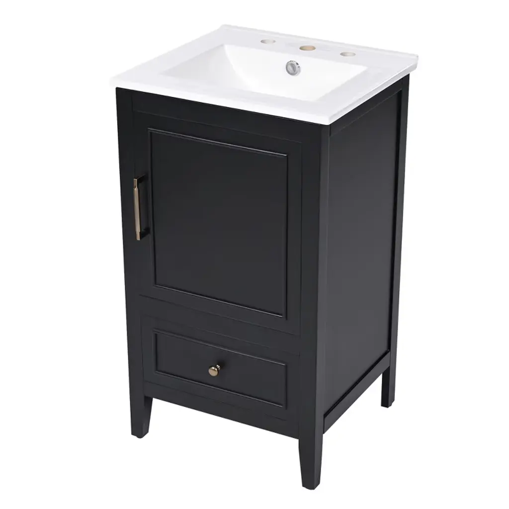 This Gulches bathroom vanity is a perfect addition to any modern bathroom It features a sleek black cabinet with a freestanding design and a durable solid rubber wood and MDF board construction The vanity includes a beautiful white ceramic sink top with an undermount drop in design and a center sink location The sink top is equipped with an integrated overflow and a three hole faucet mount The vanity cabinet offers ample storage space with one cabinet door and a large drawer The door hinges and handle are made of stainless steel to resist rust in the humid bathroom environment The cabinet also features a magnetic door stopper for silent operation The vanity comes with all necessary hardware and an instruction manual for easy assembly It has a capacity of 200 pounds and is designed to accommodate one sink The faucet mount is 8 inches The overall product dimensions are 20 inches in length 18 inches in width and 34 inches in height The cabinet base measures 19 inches in length 17 inches in width and 33 inches in height The sink top dimensions are 20 inches in length 18 inches in width and 4 inches in height This vanity is made in Vietnam and is designed to provide years of reliable use