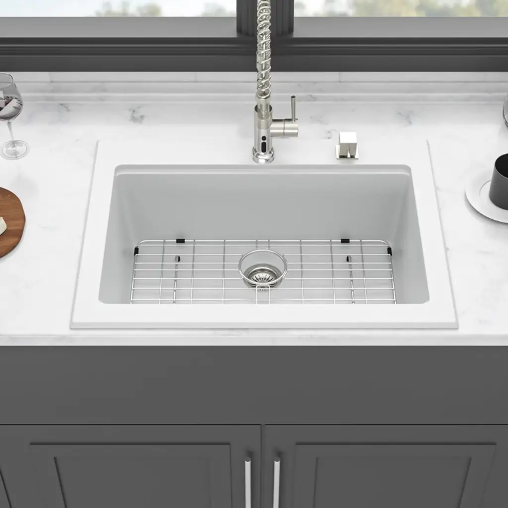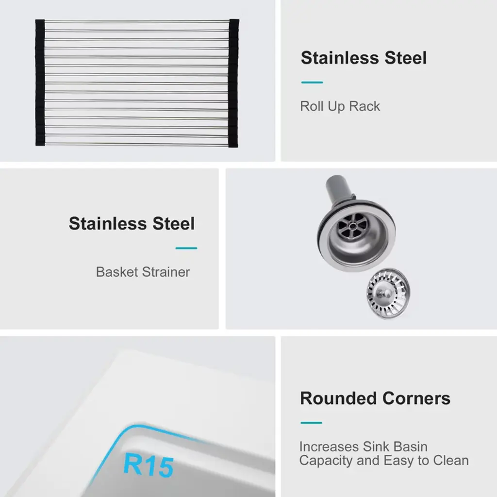 Gulches 30"x22" White Granite Composite Sink: Crafted from high-end quartz composite (stone-like look, thick/durable). Quiet design (thick stone reduces noise). Non-porous, scratch-resistant surface easy to clean (rounded corners, smooth finish). Includes drying rack, strainer, grid, cutting board, etc. Fits 33" cabinets; 3.5" drain for most disposals.