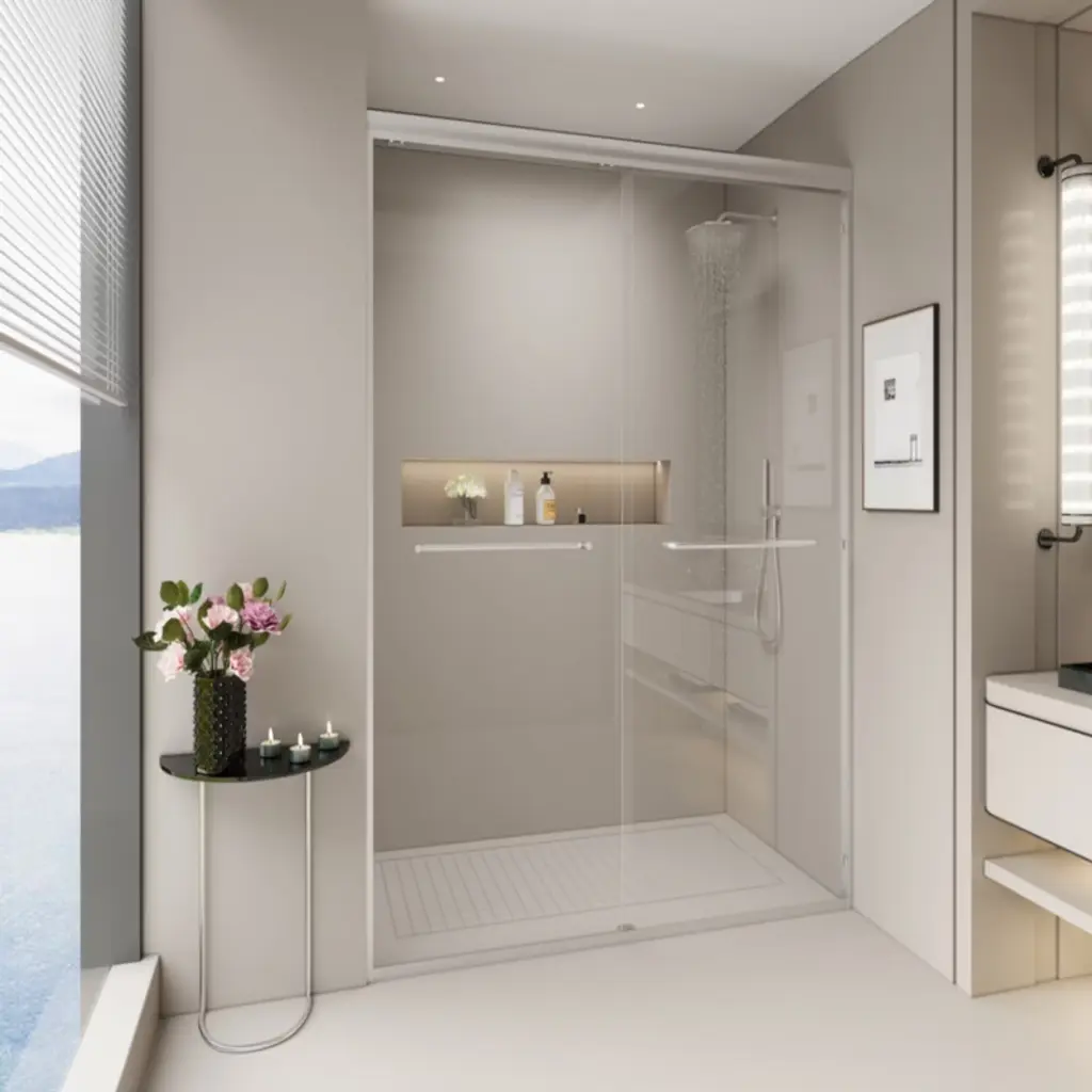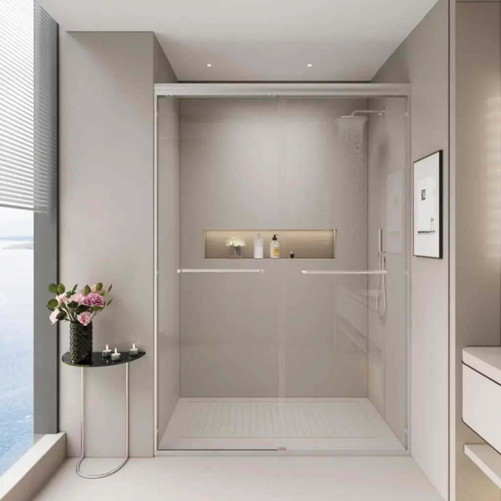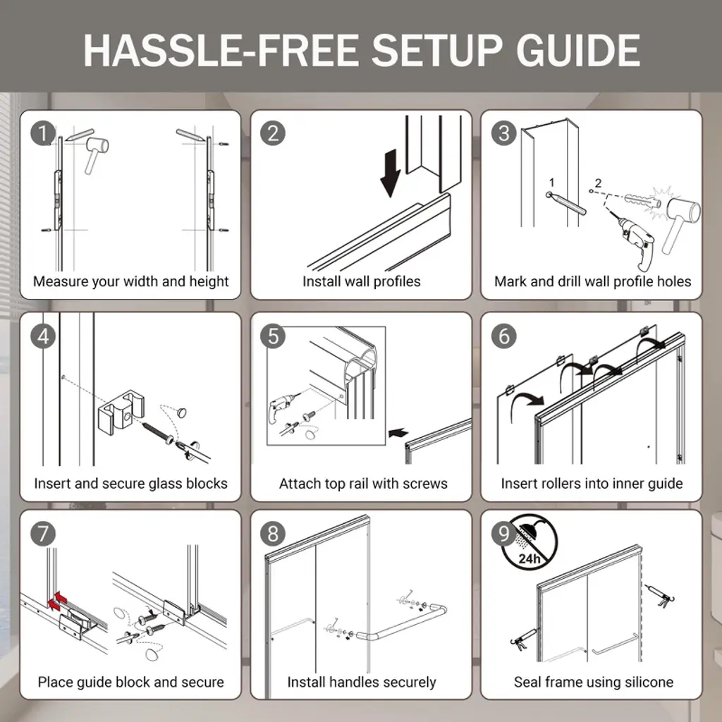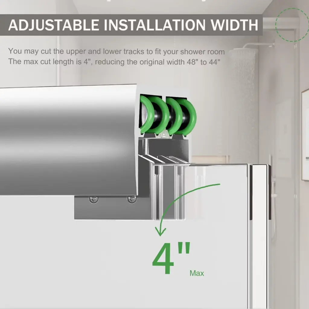 Gulches double sliding shower door brings hotel style function to compact bathrooms The semi frameless bypass unit adjusts from 44 to 48 inches wide and stands 72 inches high Two 24 inch tempered glass panels glide left or right along a reinforced aluminum rail giving a 22 inch walk in opening without swing space The 6 mm ANSI certified clear glass is coated with an invisible explosion proof film that keeps every shard attached if impact occurs so cleanup is safe and fast The lightweight aluminum alloy frame is finished in soft brushed nickel and features anti collision corners that protect both glass edges and wall tiles Full length clear vinyl seals lock water inside while stainless steel handles offer a solid grip The top guide rail can be trimmed on site for exact fit and the entire system can be installed to slide from either side Every package contains one top rail one bottom rail two glass panels four silent rollers two handles wall profiles seals screws and an illustrated installation guide Average assembly time is under one hour Once mounted the door moves quietly and stays stable through years of daily use Enjoy elegant durability backed by Gulches engineering