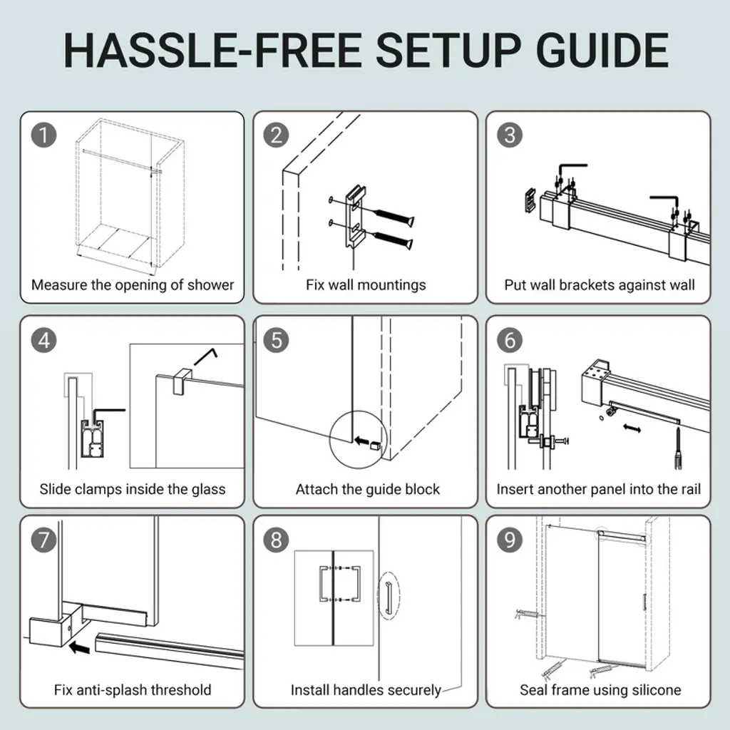 Gulches frameless single sliding shower door offers spa style comfort in a sleek understated package The enclosure fits openings 55 to 60 inches wide and stands 76 inches tall using one fixed panel and one sliding panel to deliver a wide 27 by 71 inch entry without visual clutter The 6 mm fully tempered glass carries ANSI safety certification and is backed by an invisible explosion proof film that keeps every shard attached if breakage occurs so cleanup is safe and simple A soft close damper inside the brushed nickel aluminum rail slows the 32 inch sliding panel during the final inches preventing slam noise and protecting little fingers The rail can be cut on site for a custom fit and the panel can be hung left or right to suit any bathroom layout Every package contains one top rail one bottom rail one 29 inch fixed glass panel one 32 inch sliding glass panel two stainless steel handles four sealed bearing rollers wall profiles clear vinyl seals magnetic strips screws and a step by step installation guide Brushed nickel finish resists water spots and fingerprints so the door keeps its refined satin look with minimal upkeep Once installed the unit glides smoothly without wobble and seals tightly to keep floors dry Enjoy quiet luxury and lasting safety backed by Gulches engineering