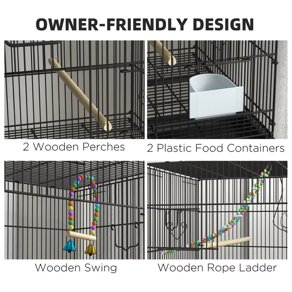 Gulches StackPlay bird cage stands 65 inches tall spans 30 inches wide and extends 18 inches deep finished in sleek black that fits any home The double stack design gives two separate living areas in one compact footprint perfect for multiple canaries lovebirds finches or budgies A steel frame supports both levels while four wheels let you roll the unit anywhere and two brakes lock it in place Each cage includes two wooden perches two food containers and a colorful wooden swing plus a rope ladder for active play Wide front doors small escape proof side doors and secure locks make feeding cleaning and interaction simple A removable tray on each level catches seed and droppings for quick daily cleanup The bottom shelf stores extra treats toys and supplies out of the way Assembly takes minutes with pre drilled panels all hardware and clear instructions included in one package