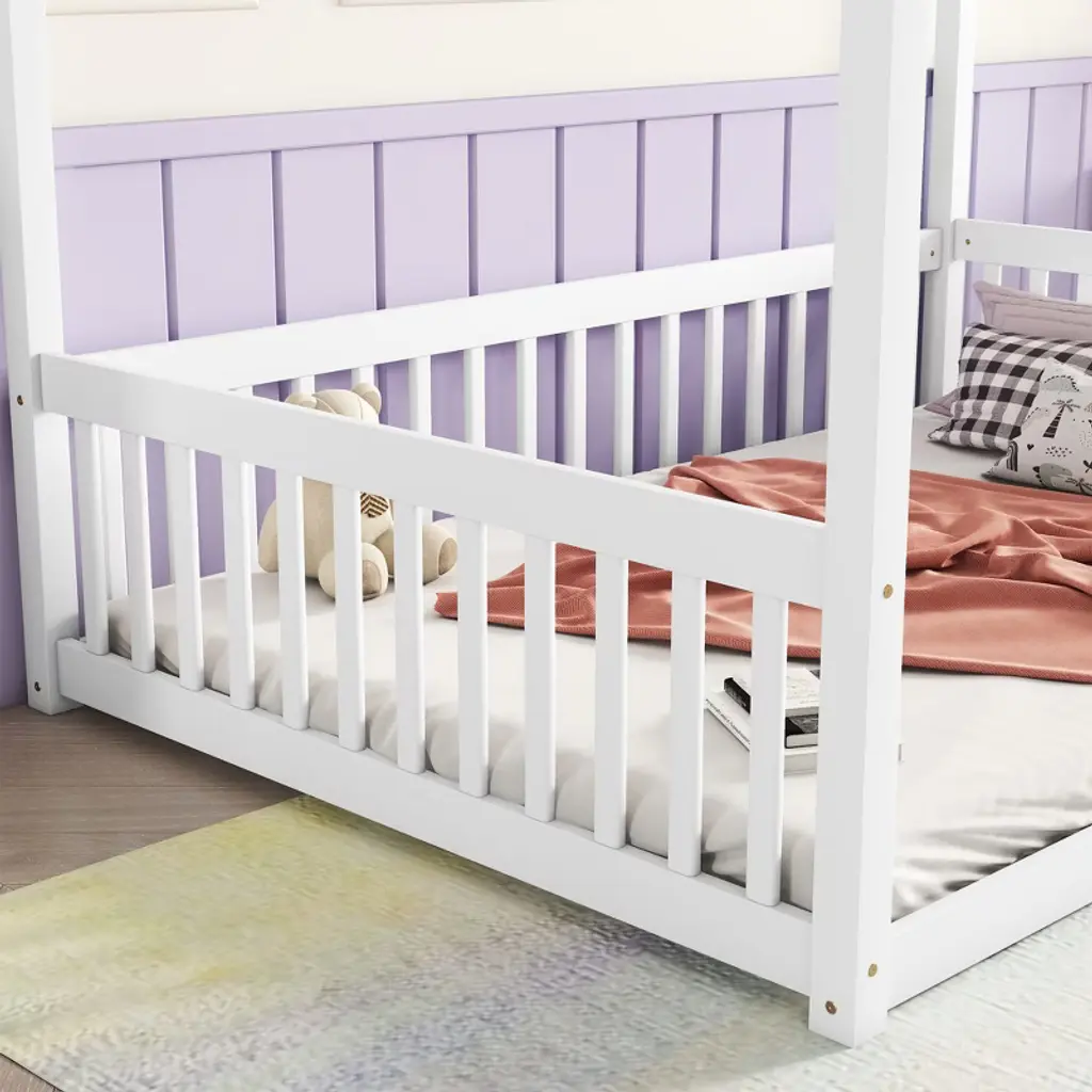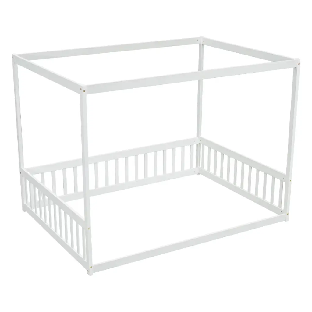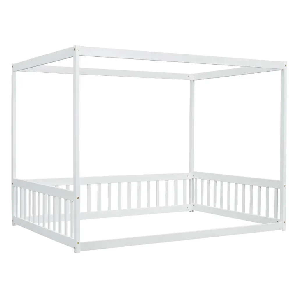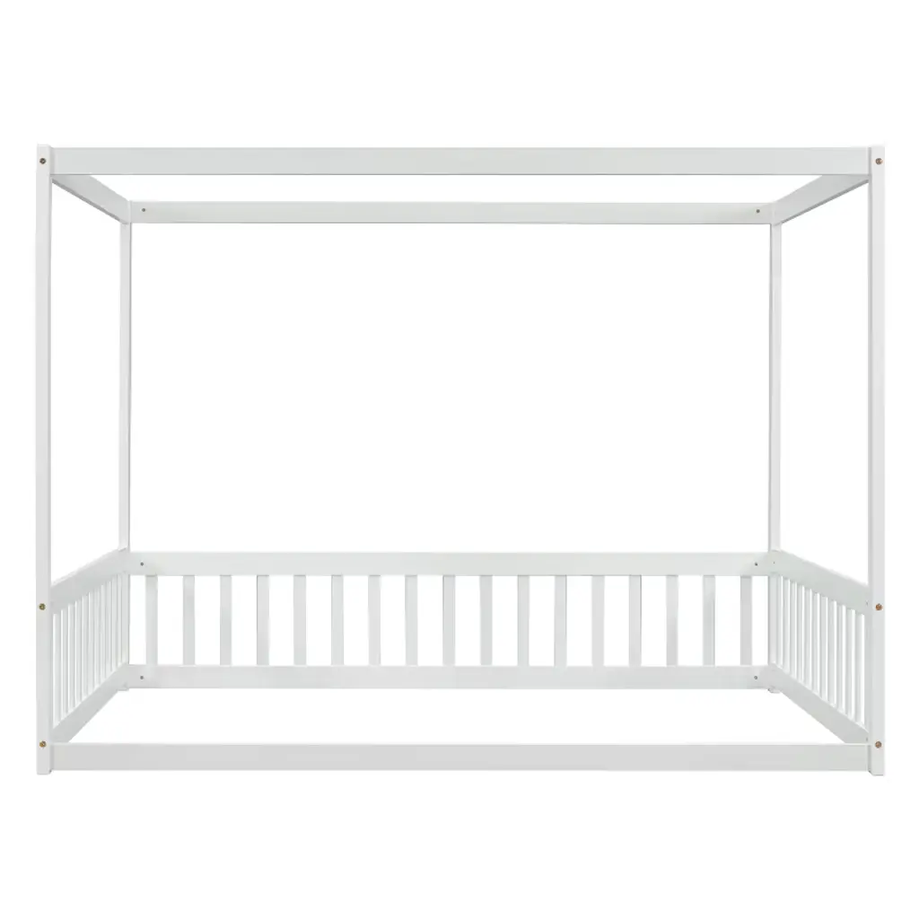 Gulches Full Size Wooden Canopy Frame Floor Bed - Fence, Guardrails, Minimalist Design, White