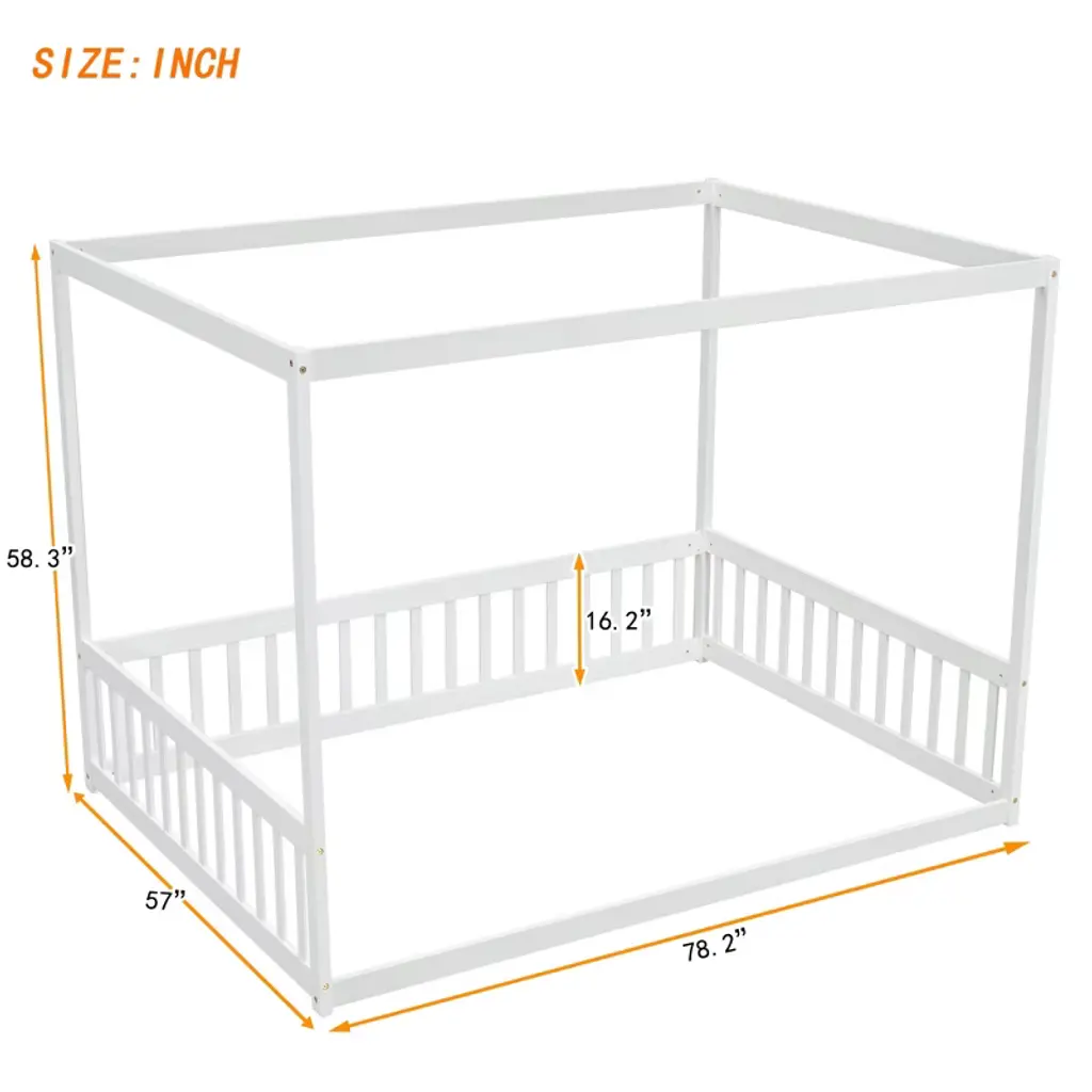 Gulches Full Size Canopy Floor Bed blends charm and safety. Its wooden canopy frame sparks imagination¡ªdecorate with curtains or ornaments for dreamy nights. Fence guardrails boost stability, reduce safety worries, and fit standard floor mattresses (suggested <6¡±, not included). Crafted from premium pine wood for lasting sturdiness. Guardrails with an opening enable easy access, creating a private space for play/reading. Ships in one package with manual and hardware for easy assembly.