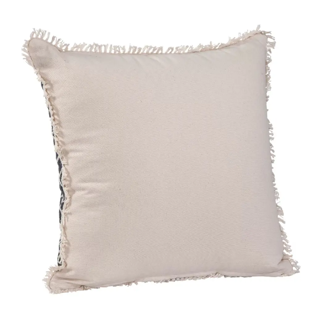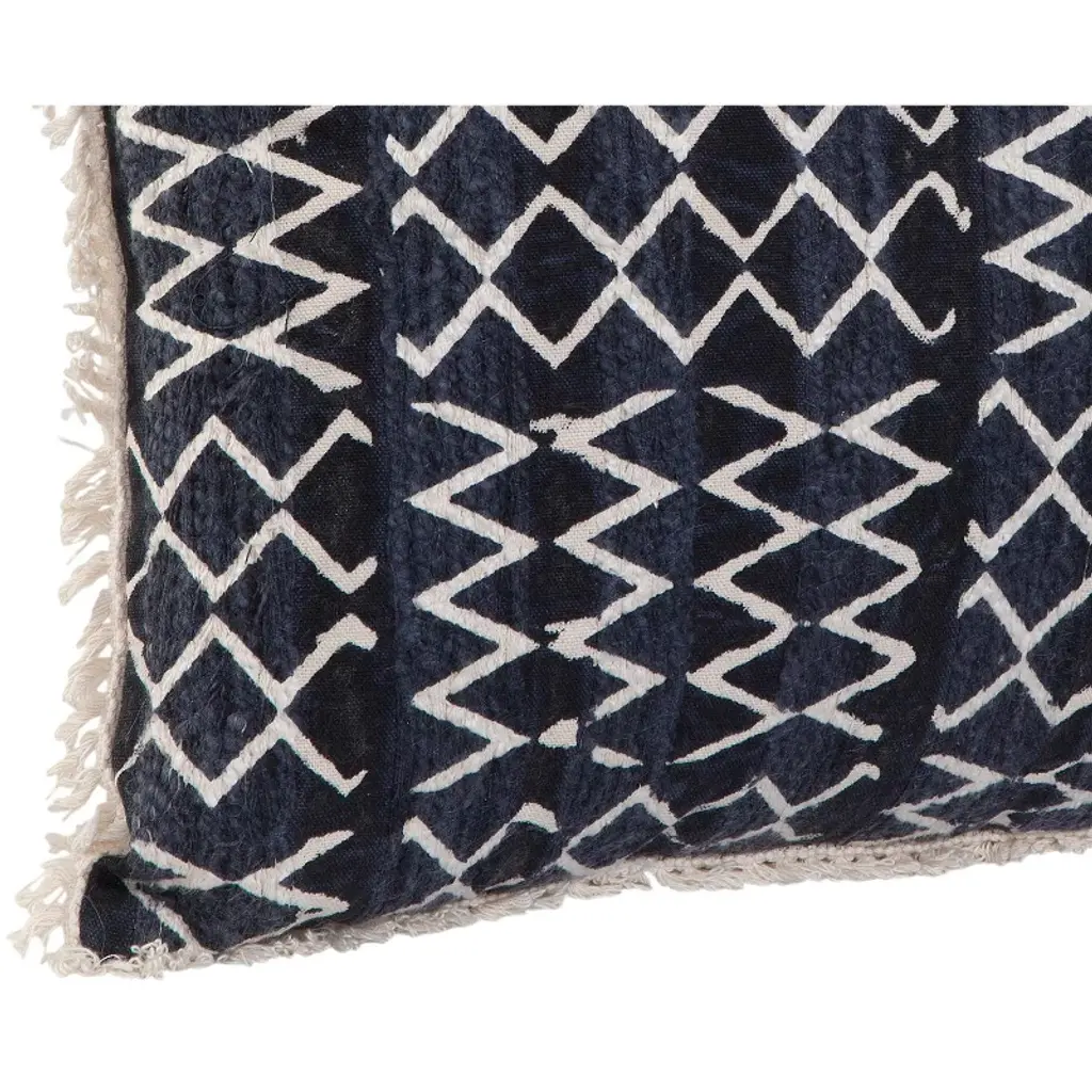 Spruce up your space with Gulches Navy/White Corvas Throw Pillow! Fun fringed design has textured stripes + geometric motifs, complementing most styles. Handmade in India (soft cotton blend, cotton canvas backing); zippered cover remove plush polyester insert for spot cleaning.