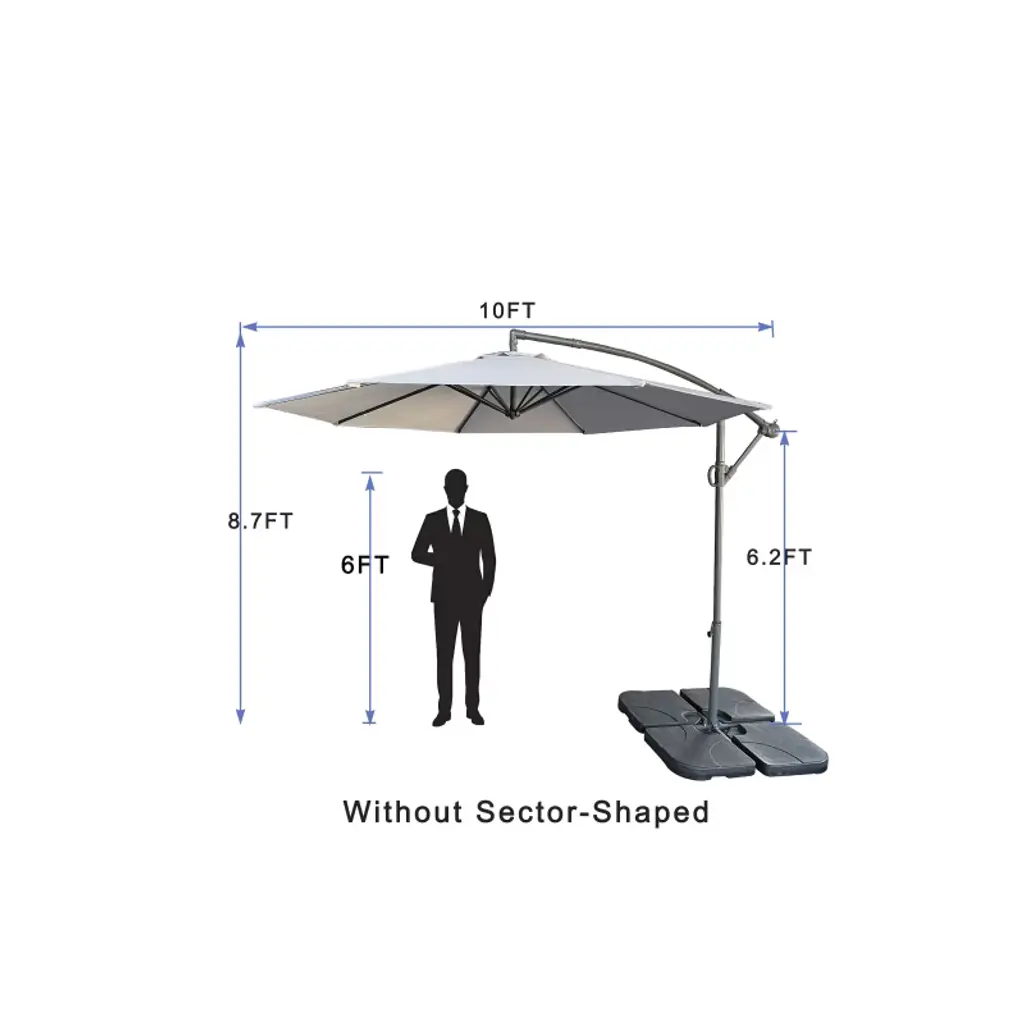 Gulches 10ft offset cantilever umbrella features a unique banana-shaped canopy for larger, ergonomic shade. UV-resistant fabric and 8-rib aluminum-steel alloy frame (1.9" pole) withstand 30 MPH winds. Smooth crank opens/closes quickly; infinite 45° tilt adjusts shade. Portable with carrying case ideal for pools, decks, beaches. No plastic base.