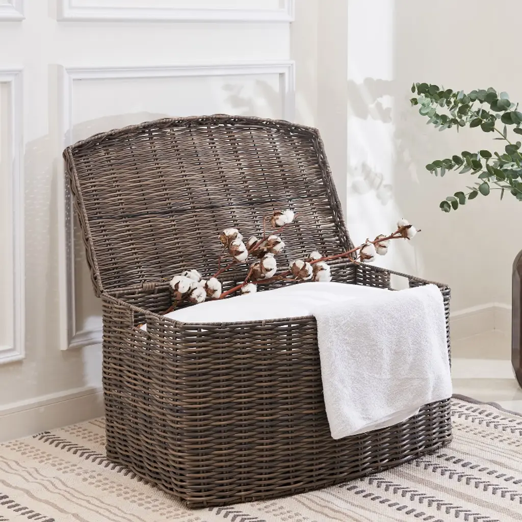 Elevate your storage game with the Gulches Rectangular Curve Resin Woven Wicker Trunk in elegant chocolate brown! This beautifully designed trunk is perfect for organizing clothes, towels, toys, and magazines. Its unique curved shape adds a touch of sophistication to any room, while sturdy handles ensure easy transport. Combine style and functionality to enhance your home decor with this versatile storage solution!