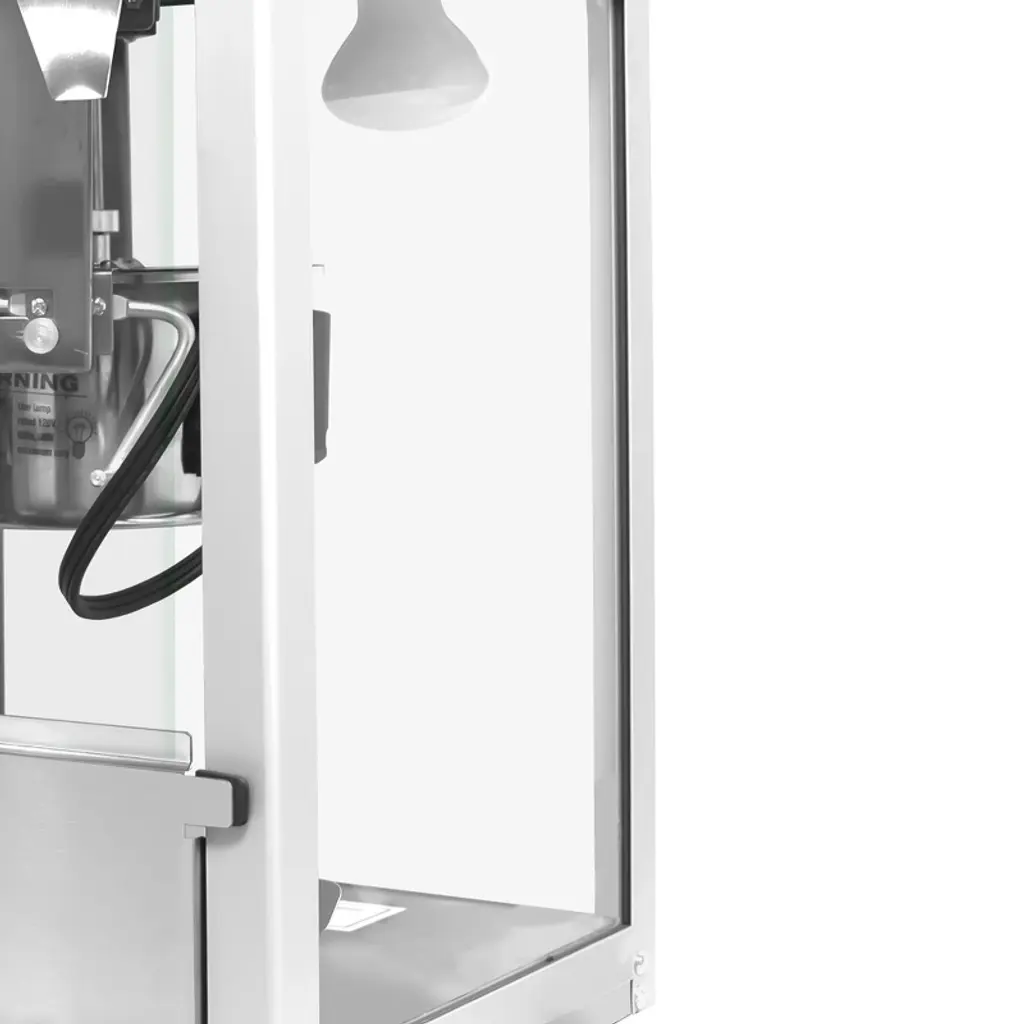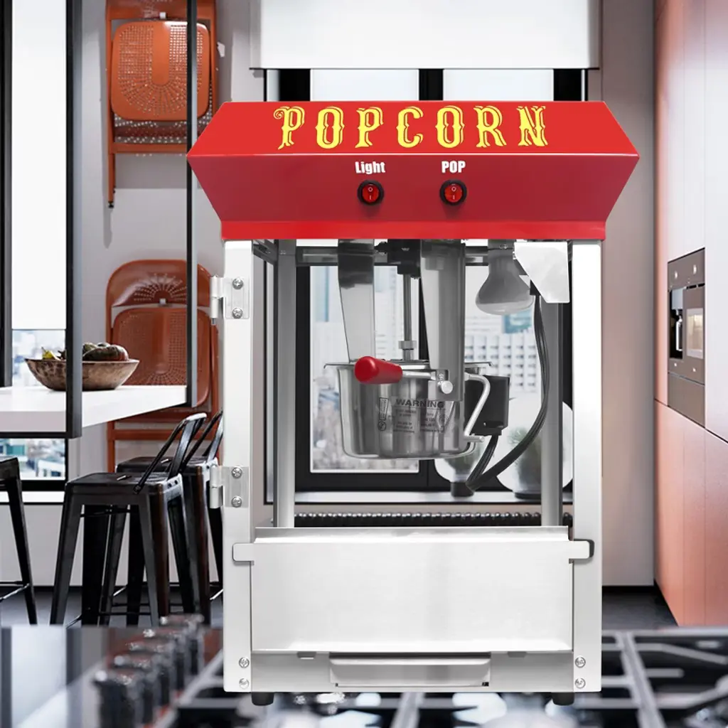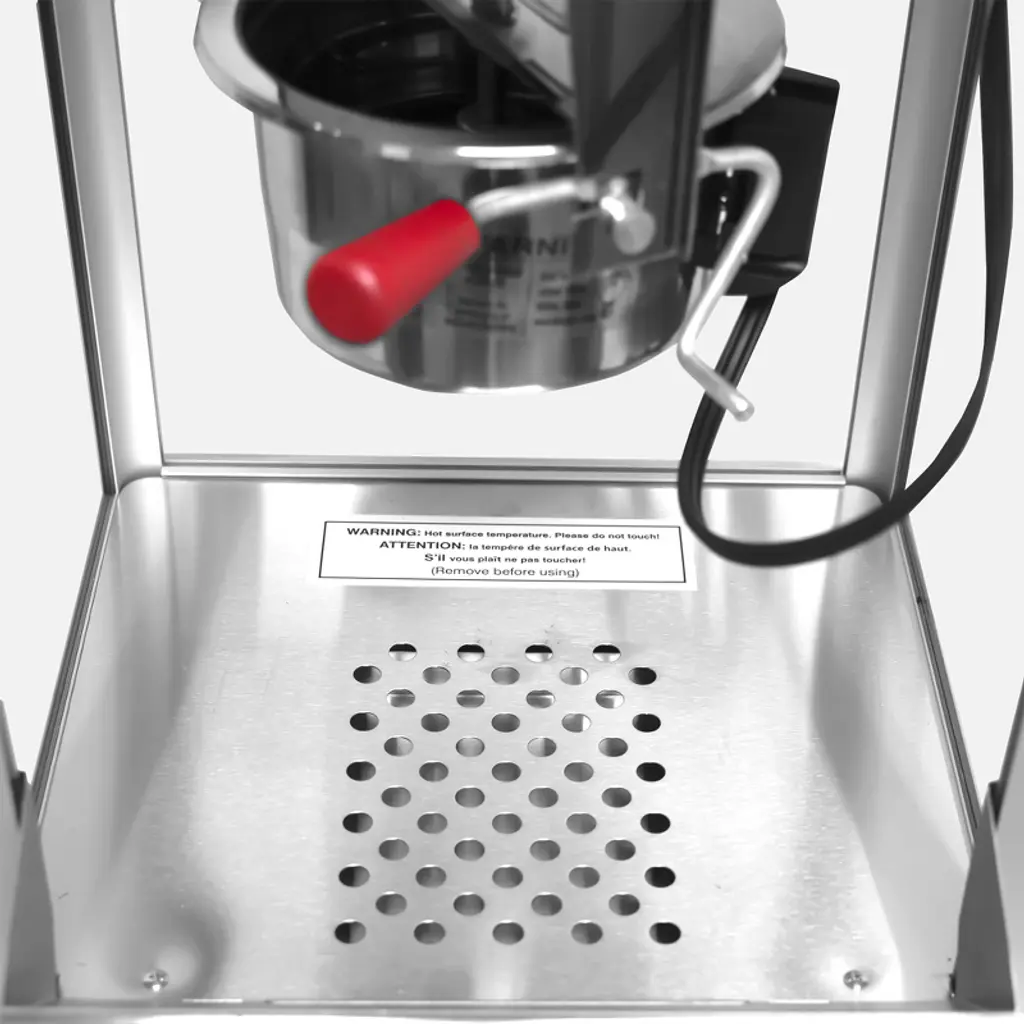 This 600W popcorn machine features a 6 ounce stainless steel kettle producing up to 2 gallons of popcorn per batch It includes a built in warming deck and a reject kernel tray for easy cleanup The machine combines vintage charm with modern functionality and is perfect for any setting