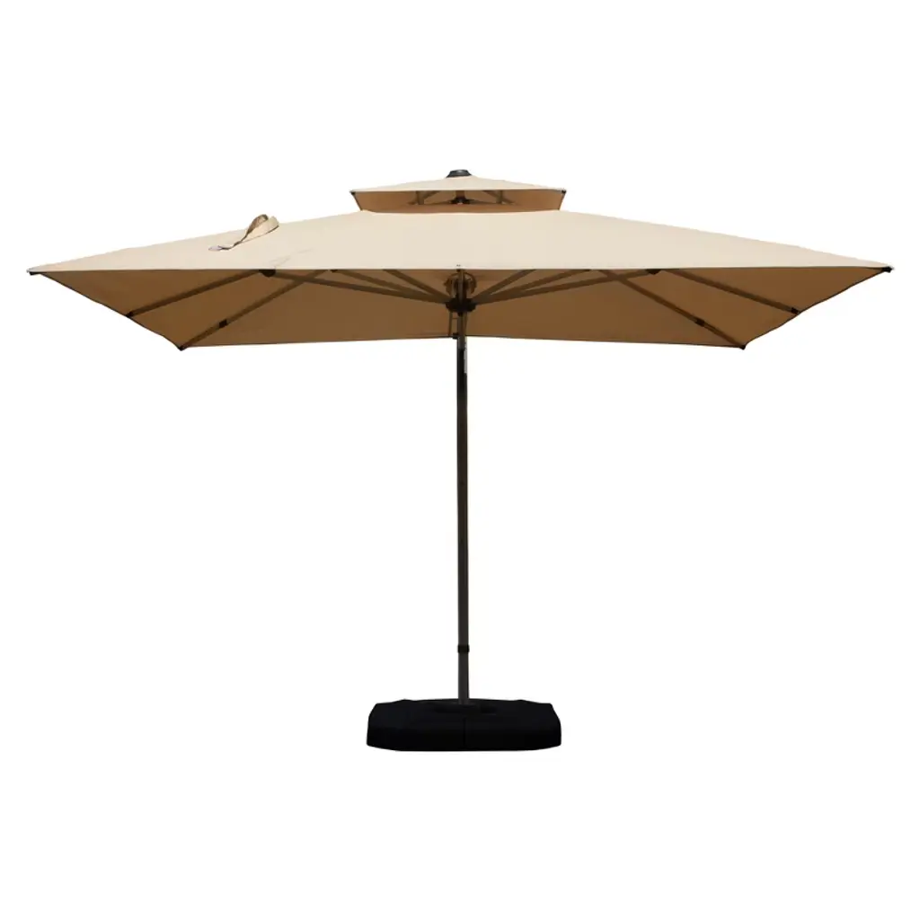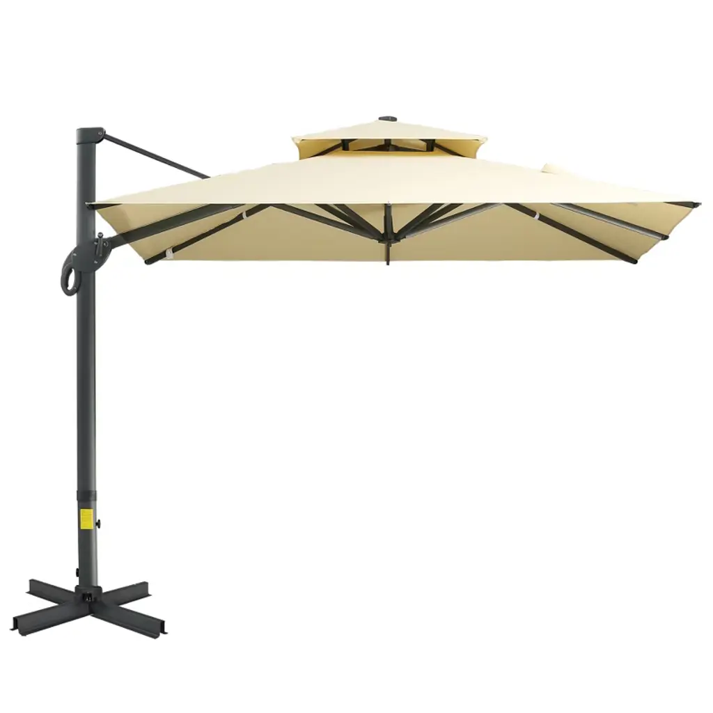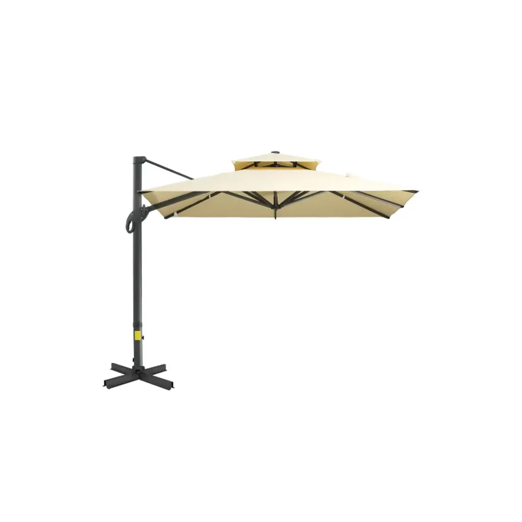 Gulches 10'x10' square cantilever umbrella offers versatile shade. 360° rotation via foot pedal tracks the sun; 5-position tilt (15°-60°) with ergonomic handle sets angles. Hydraulic opening ensures smooth operation. 9-rib rustproof aluminum frame + 250GSM polyester (UPF 50+) deliver durability. 10,000-cycle tested, triple-stitched. Base not included.