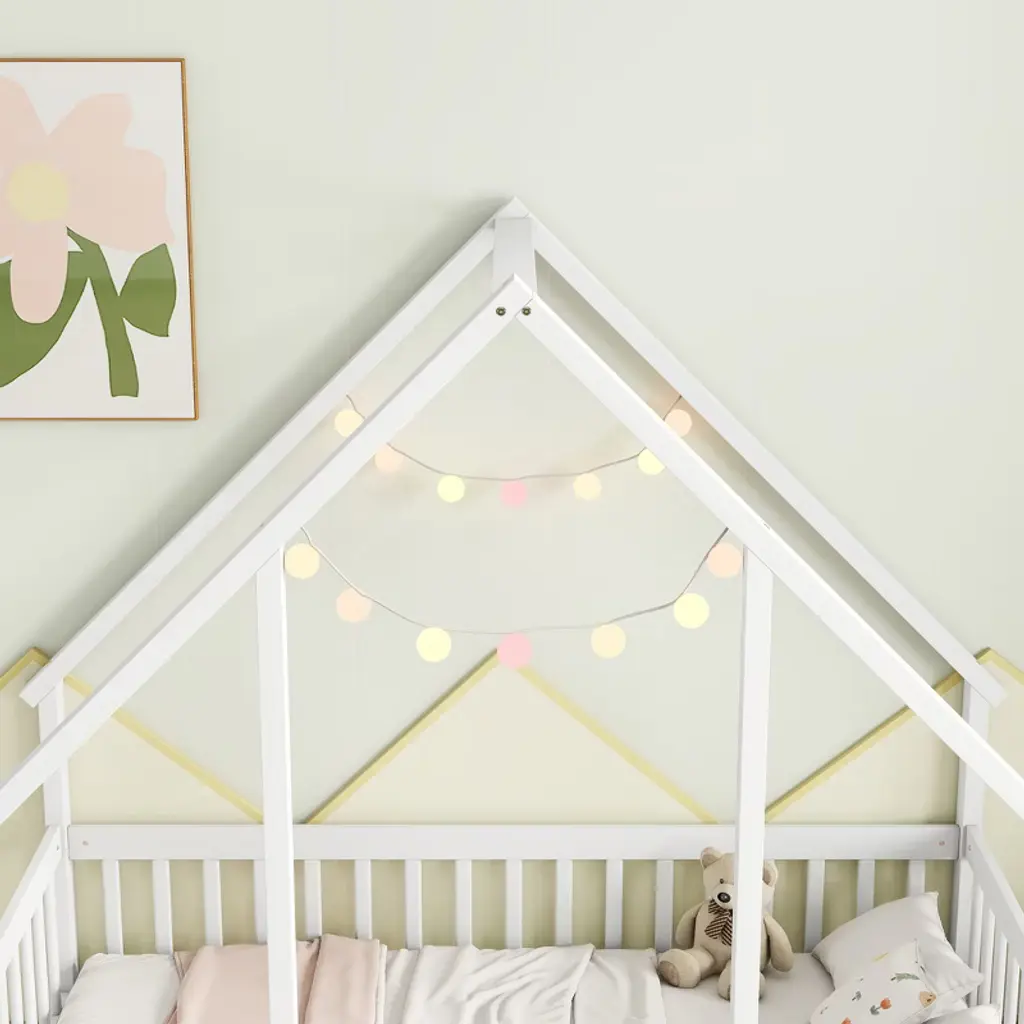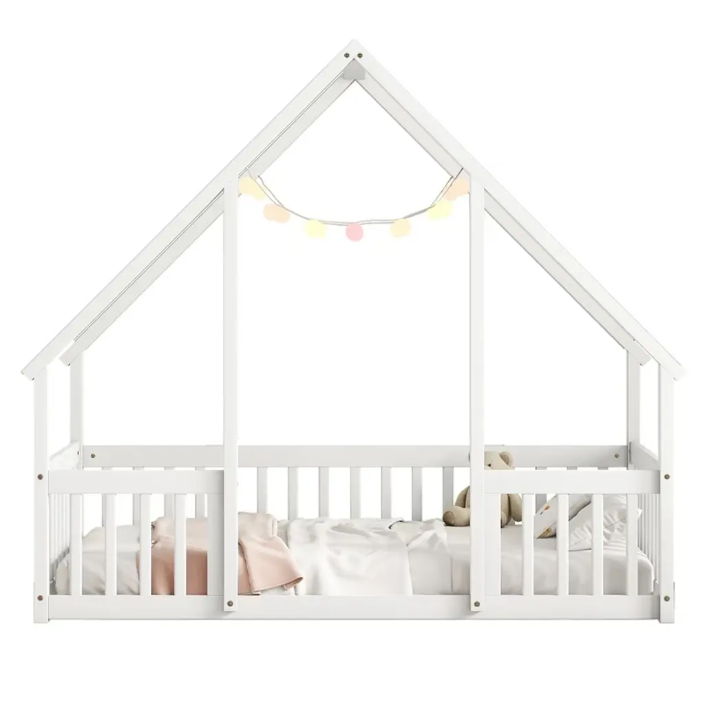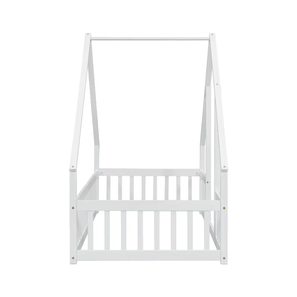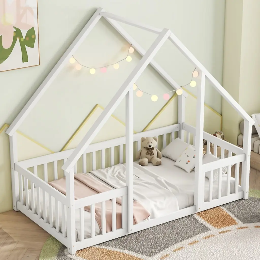 Gulches Twin Wood House Floor Bed brings fun and safety to bedrooms. Its unique house roof frame sparks imagination¡ªdecorate with accessories for sleep and play. Fence guardrails boost stability, reduce safety worries, and support floor mattresses (not included). Crafted from premium pine wood for lasting sturdiness. Guardrails with an opening enable easy access, creating a private space for reading/play. Ships in one package with manual and hardware for easy assembly.