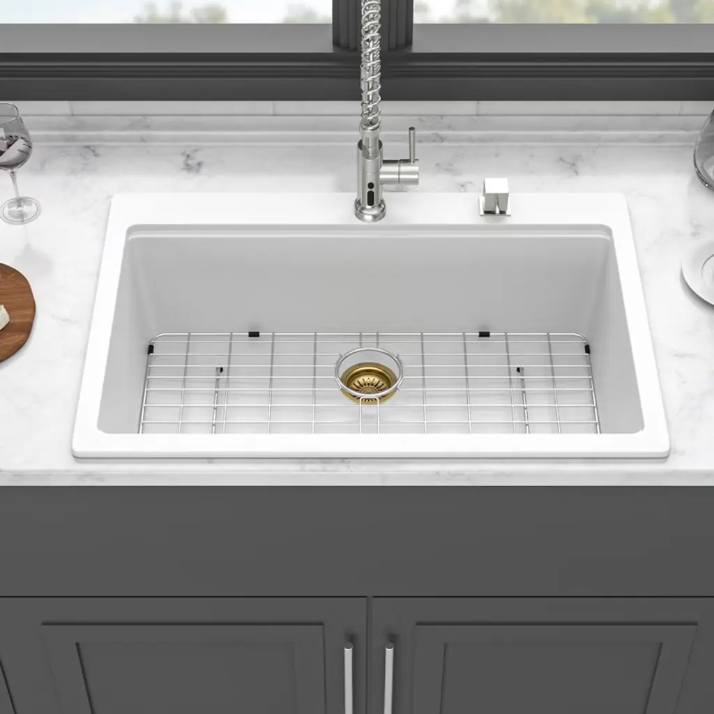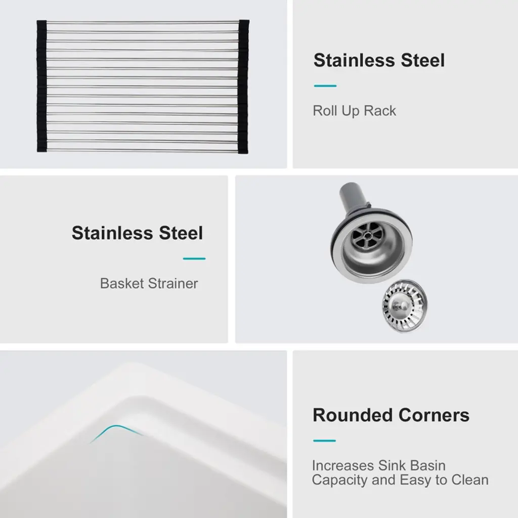 Gulches 33"x22" white granite composite workstation sink blends stone-like elegance with durability. Its thick material reduces noise, while the smooth, non-porous surface resists dirt and scratches. Rounded corners simplify cleaning. Fits 36" cabinets, with a standard 3-1/2" drain. Includes drying rack, strainer, cutting board, and installation tools for easy setup.