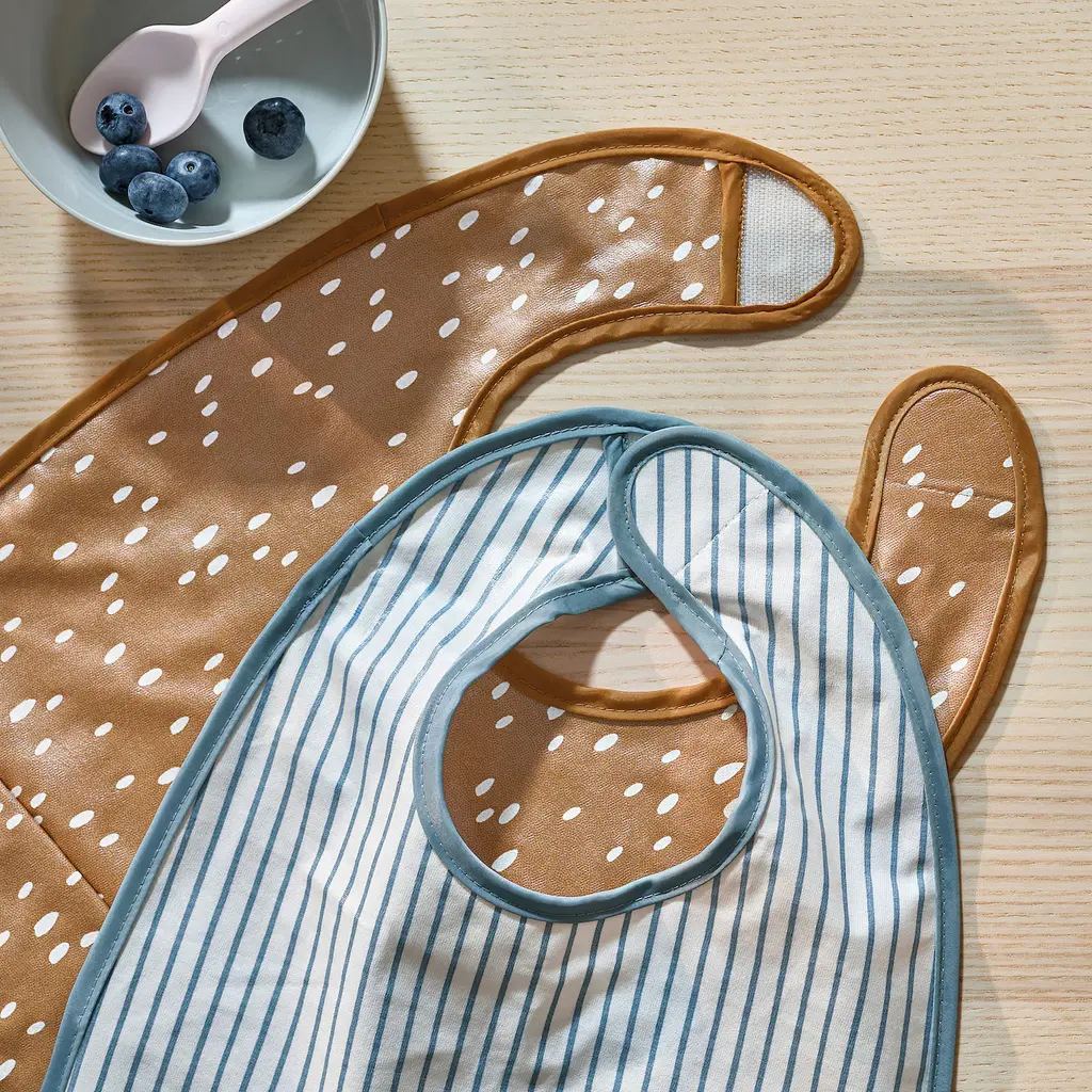GULDVÄVARE Bib - dark yellow/white. The bibs are easy to adjust to the child's neck and easy to put on and remove since they fix in place with touch-and-close fastening. Easy to put on and practical to bring in your bag on excursions. Easy to fold and store for the next meal.