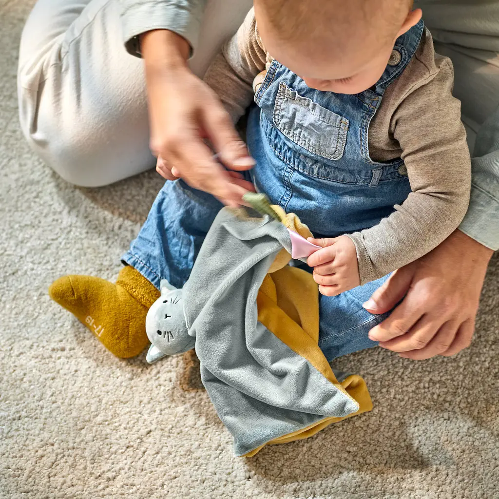 GULDVÄVARE Snuggle blanket with soft toy - blue yellow/cat. This soft blanket with a soft toy can comfort, warm, be a fun play buddy and be your child's best friend as they grow up. Perfect to bring in the pram, on trips or when you’re visiting relatives and friends. Recommended for all ages.