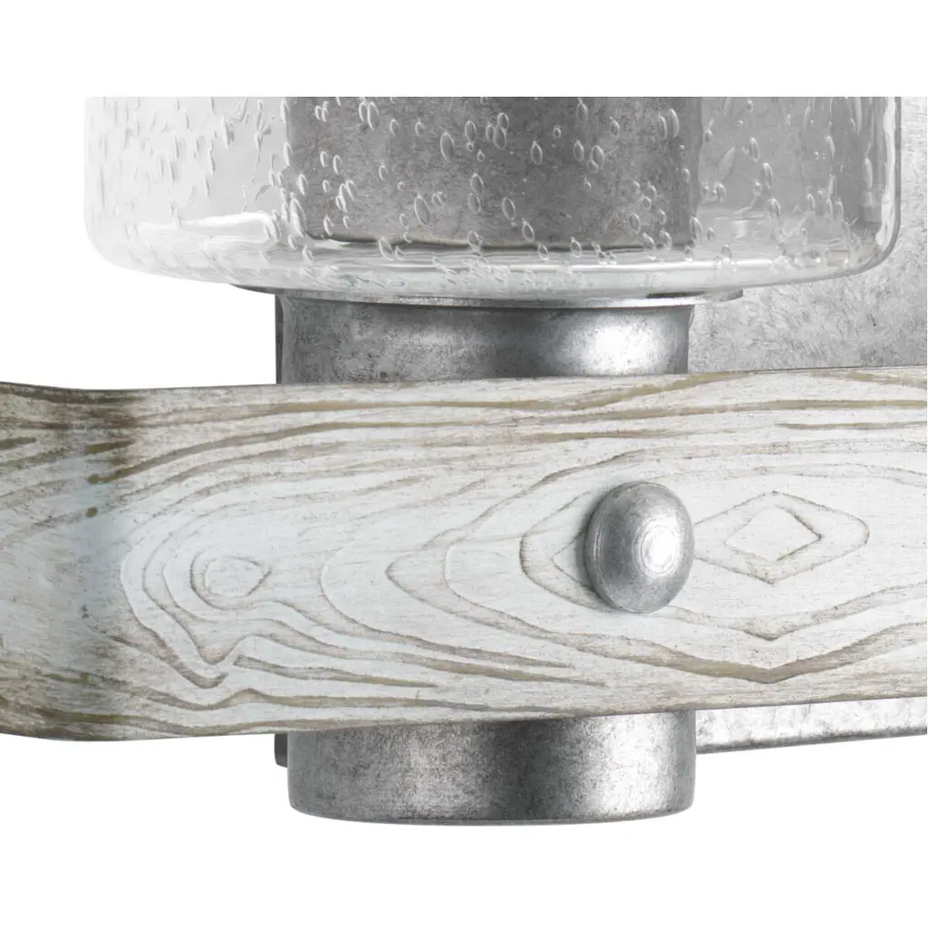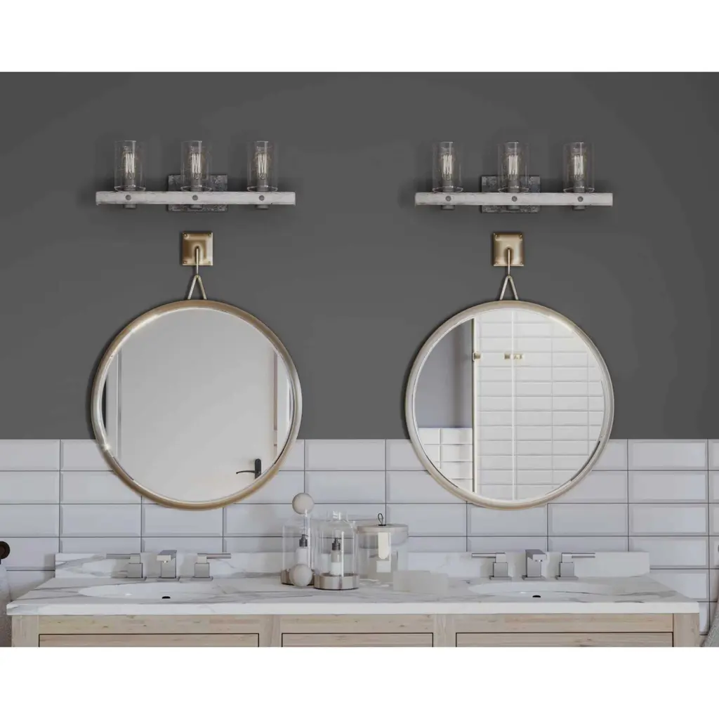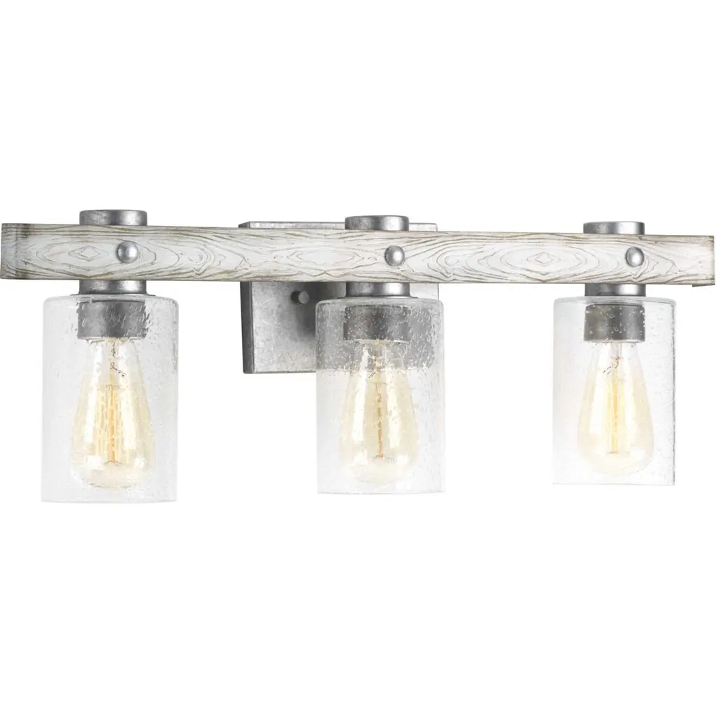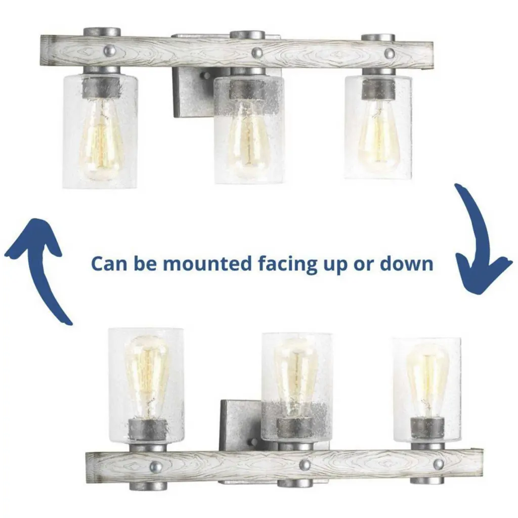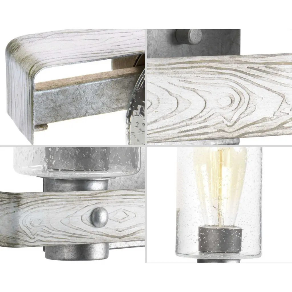 The Gulliver Collection three-light bath & vanity feature a dual toned frame color combinations of Galvanized with antique white accents. A hand painted wood grained texture complements Rustic and Modern Farmhouse home decor, as well as Urban Industrial and Coastal interior settings.