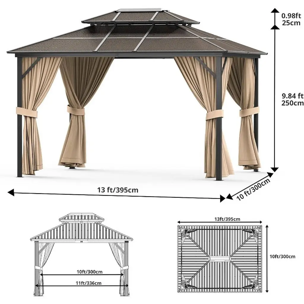 The Hardtop Gazebo features a sturdy aluminum frame and a ventilated polycarbonate double roof that offers durable weather protection and enhanced ventilation. Its spacious design, easy assembly, and added curtains with netting make it ideal for versatile outdoor use, providing shade, privacy, and insect protection.