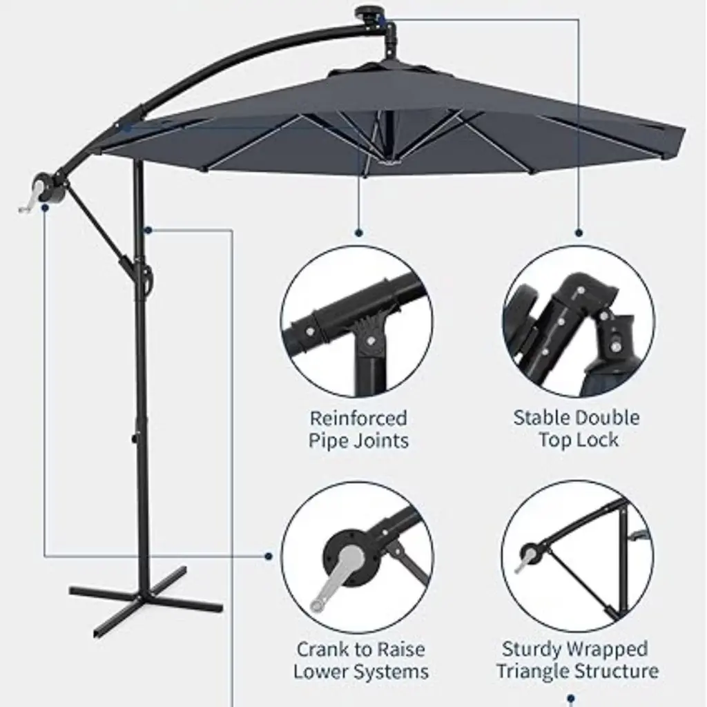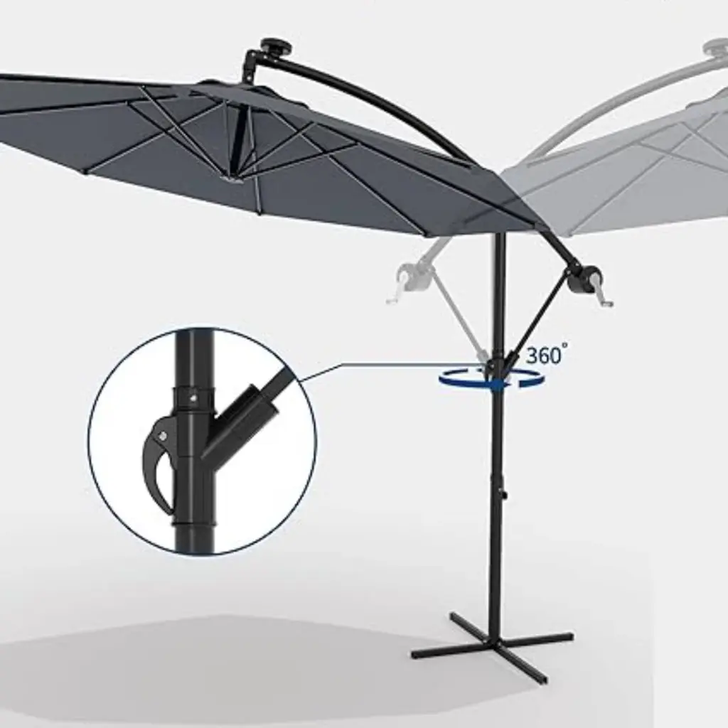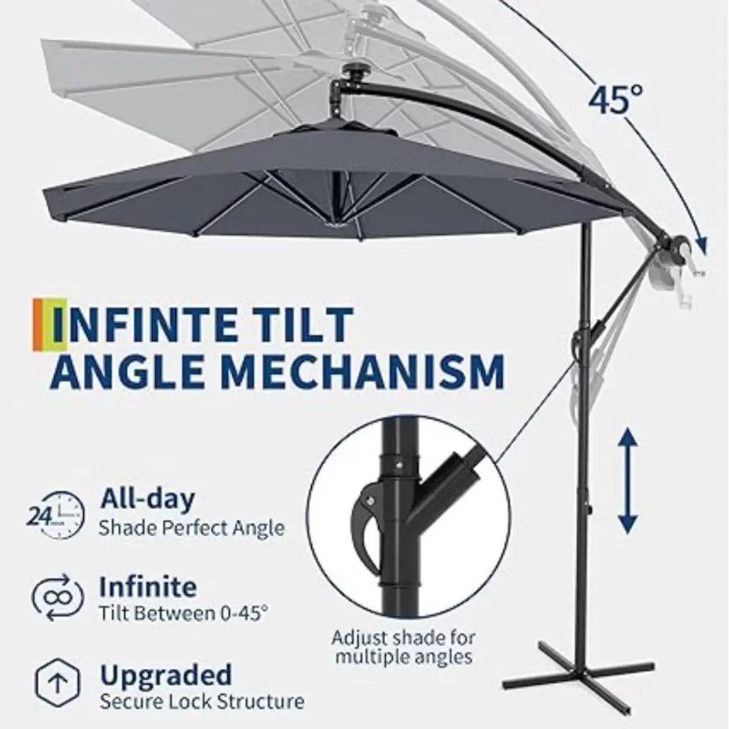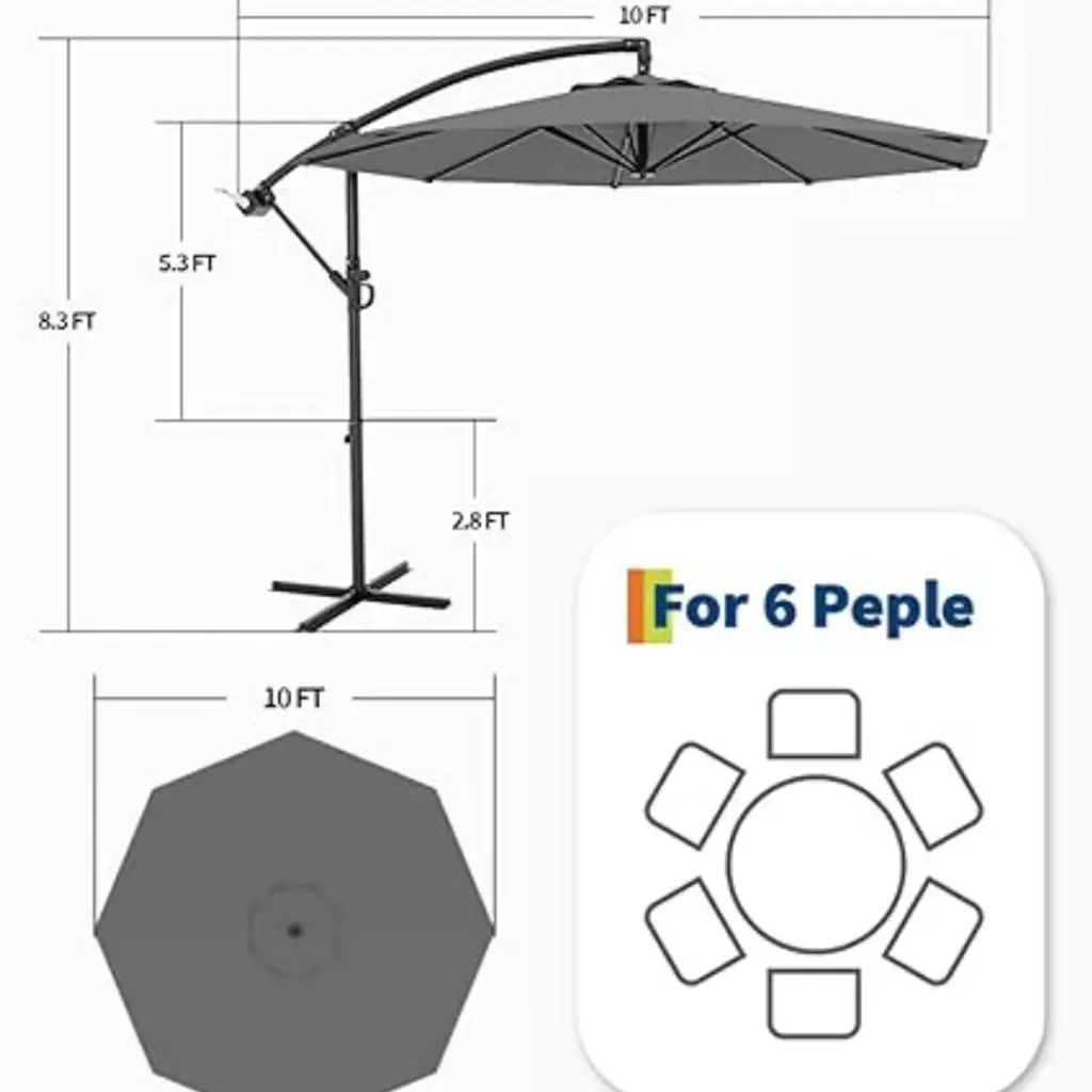 This 10ft offset patio umbrella features a rust-resistant frame, 360 rotation, easy tilt and lift system, and provides ample, adjustable shade for outdoor spaces like lawns, gardens, or poolside relaxation.