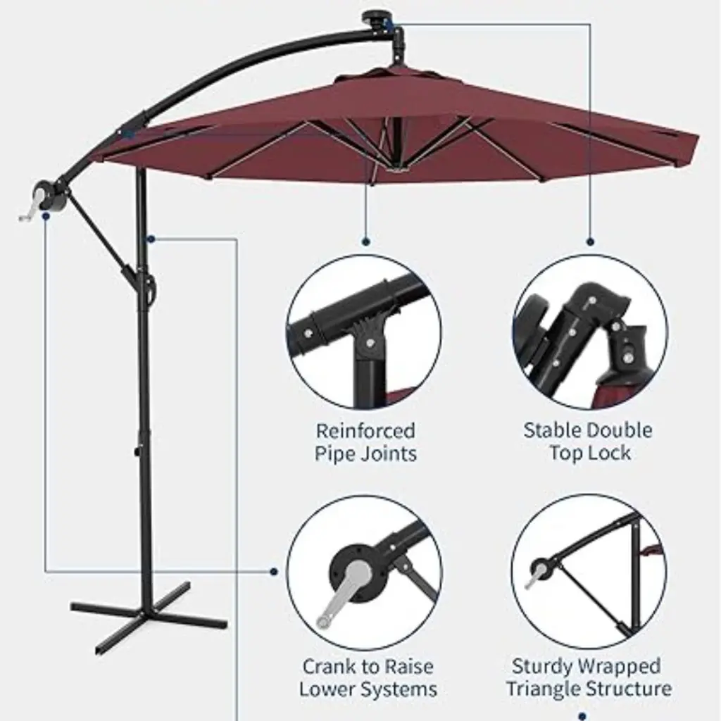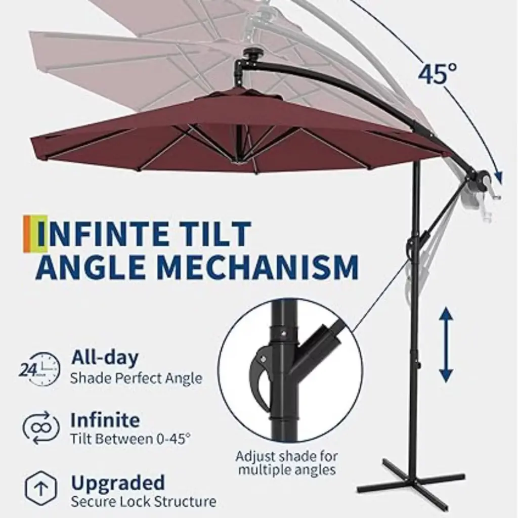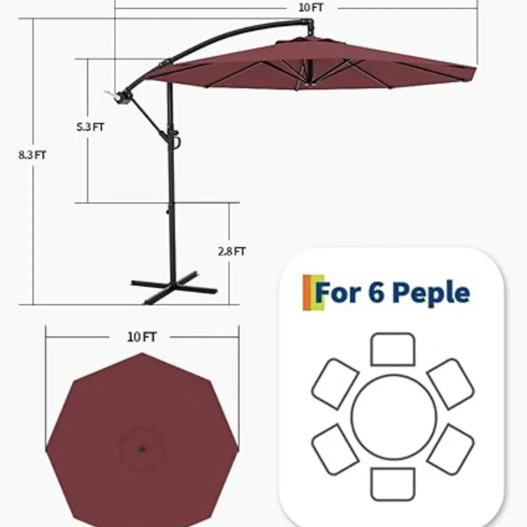 This 10ft offset patio umbrella features a rust-resistant frame, 360 rotation, easy tilt and lift system, and provides ample, adjustable shade for outdoor spaces like lawns, gardens, or poolside relaxation.