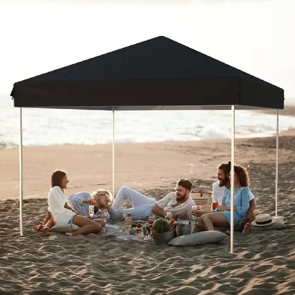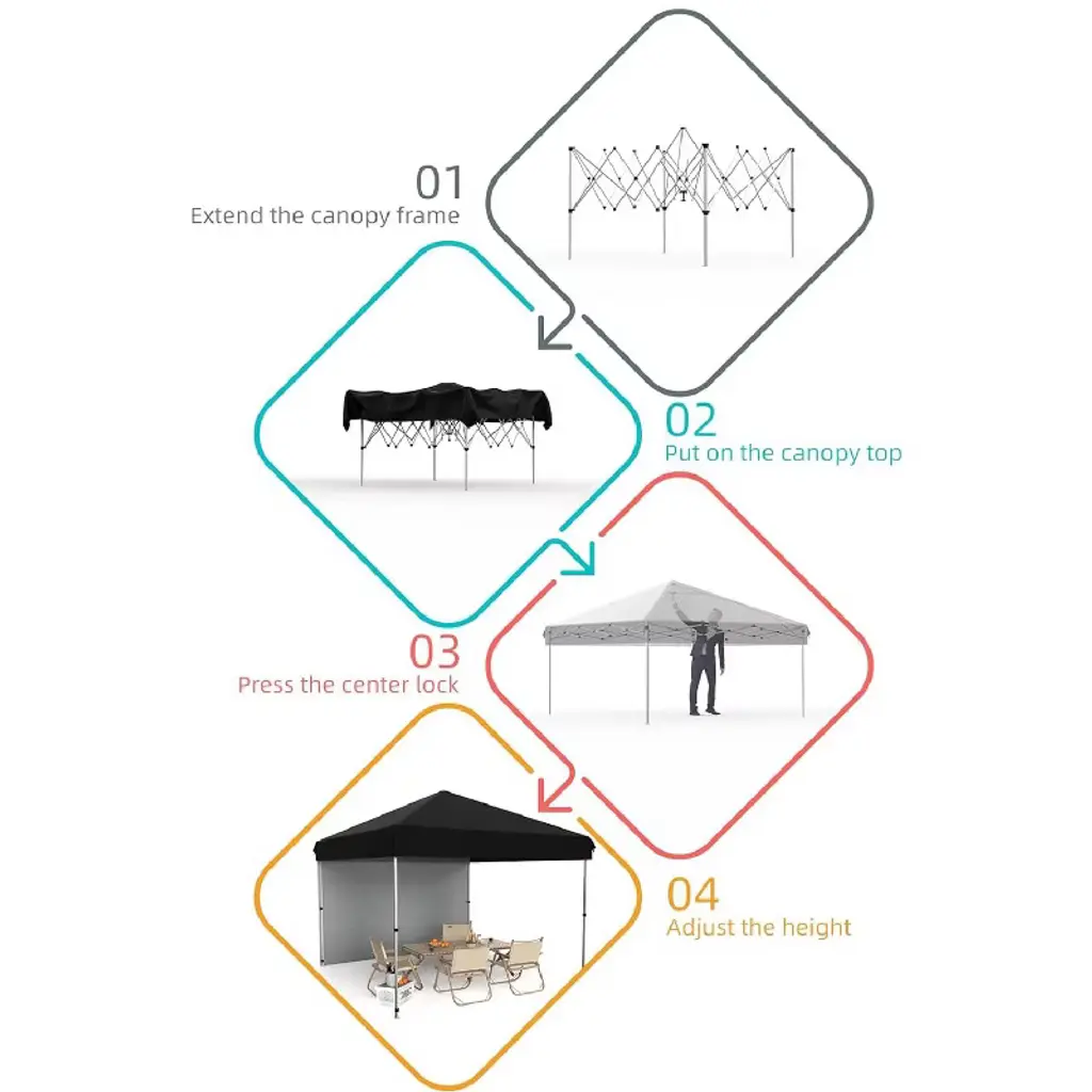 This 10x10ft pop-up canopy offers quick one-person setup, durable UV-blocking fabric, adjustable side walls, easy portability with a roller bag, and versatile use for various outdoor events, with comprehensive accessories and after-sales support included.