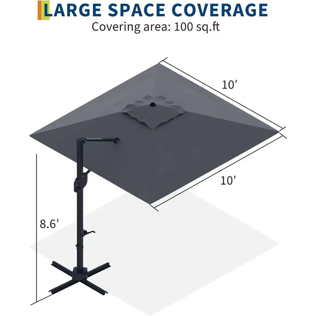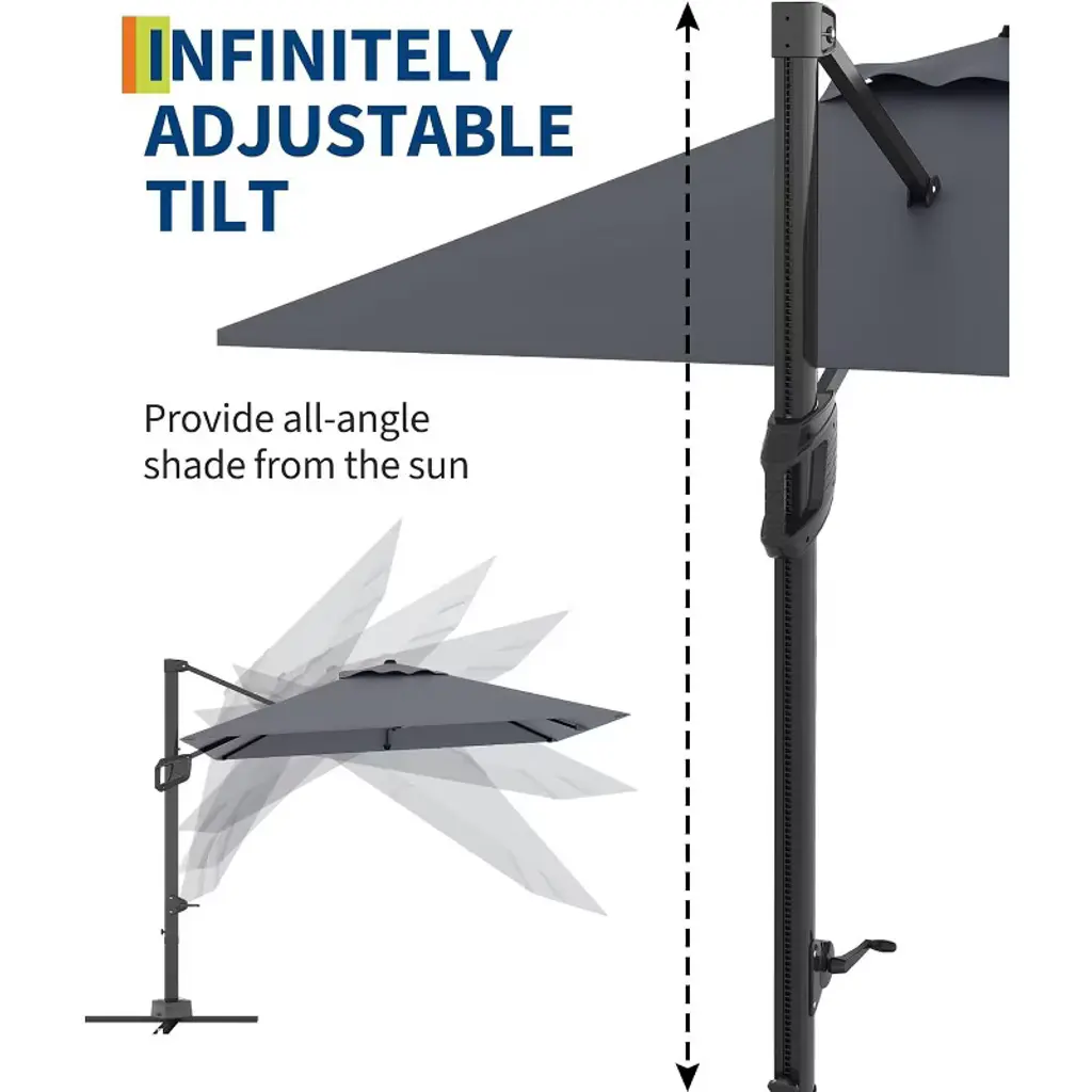 This 10'x10' freestanding cantilever umbrella offers 360¡ã rotation, instant tilt adjustment, and all-weather durability with a stable, rust-proof frame¡ªproviding versatile, customizable shade for any outdoor space.