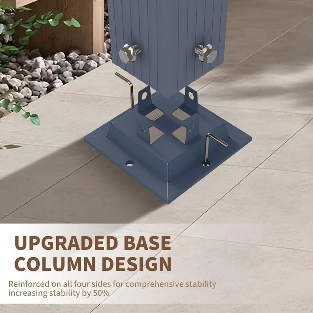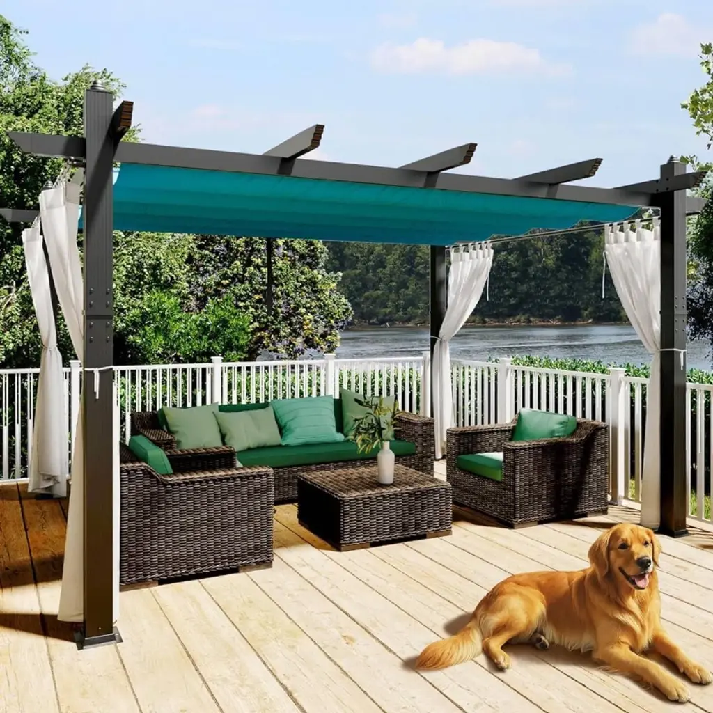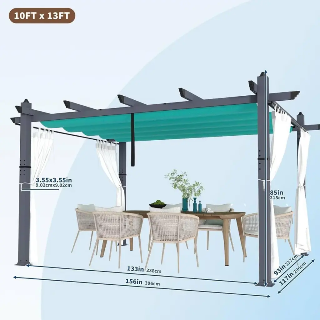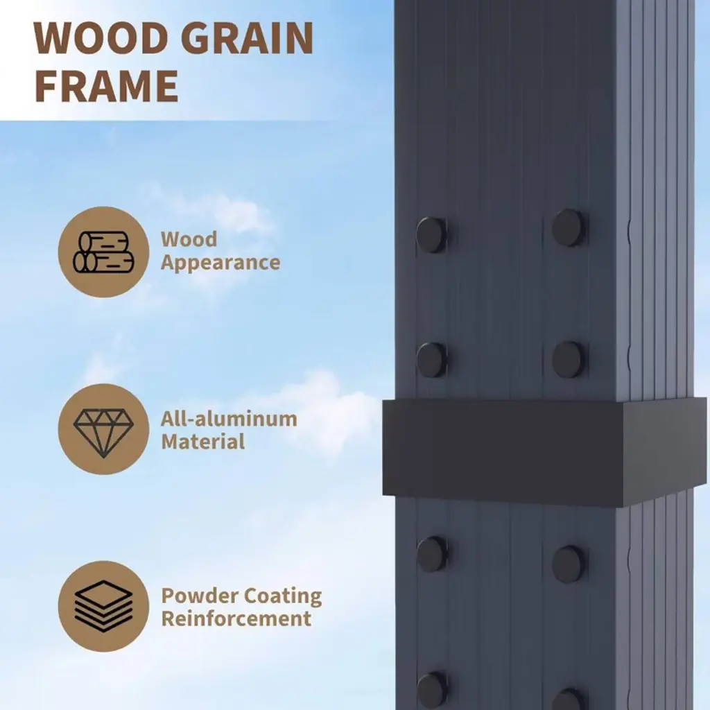 This commercial-grade aluminum pergola features a powder-coated, weather-resistant frame with reinforced stable base, a stylish design with adjustable UV-blocking canopy and bug netting, easy tool-free assembly, and versatile climate control for comfortable outdoor living.