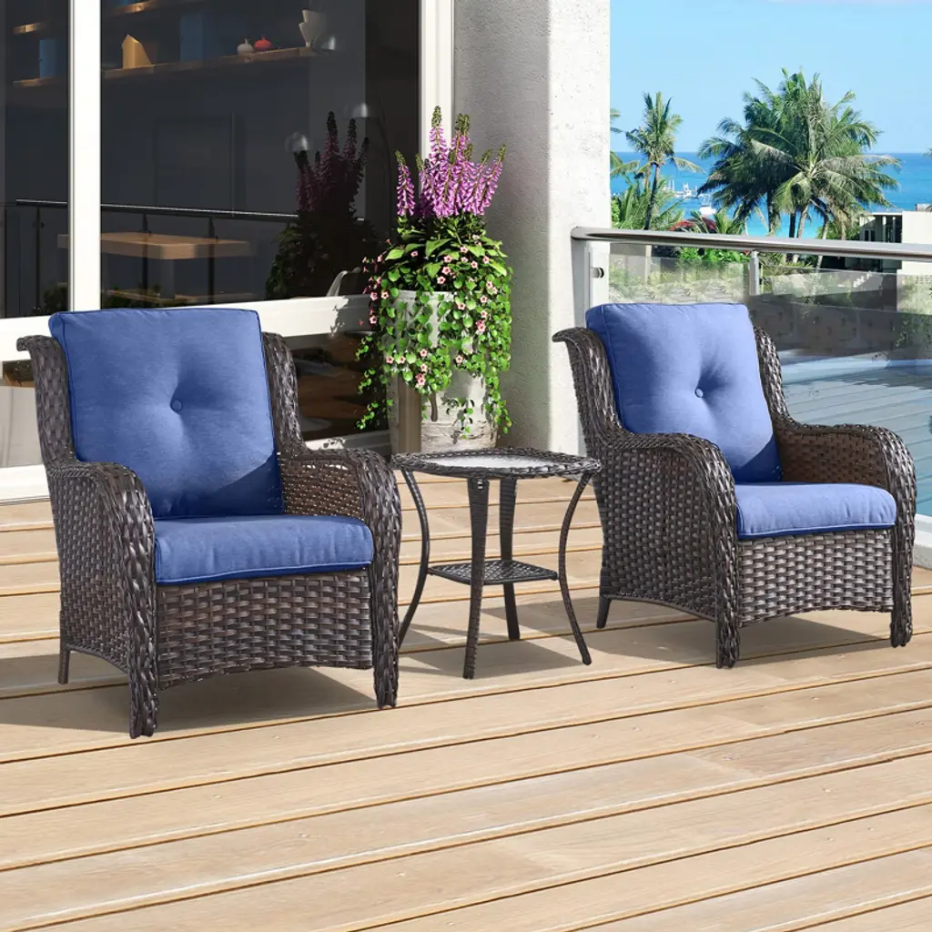 This Easy-To-Assemble, 3-Piece Pe-Wicker Bistro Set Combines Two Plush-Cushioned, Weather-Resistant Chairs And A Sleek Round Glass-Top Table, Delivering Durable, All-Season Comfort And Style For Entertaining On Any Patio, Porch, Deck, Or Poolside.