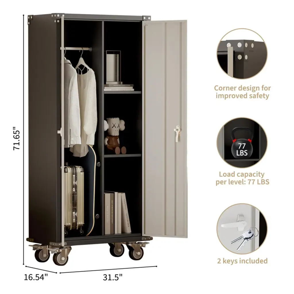 Gustowave 71.7" Metal Locker Storage Cabinet, Heavy-duty Rolling Tool Cabinet With Lockable Doors & Adjustable Feet, Garage Utility Storage