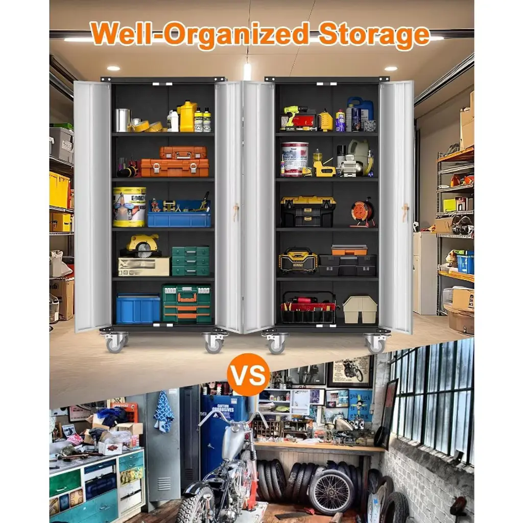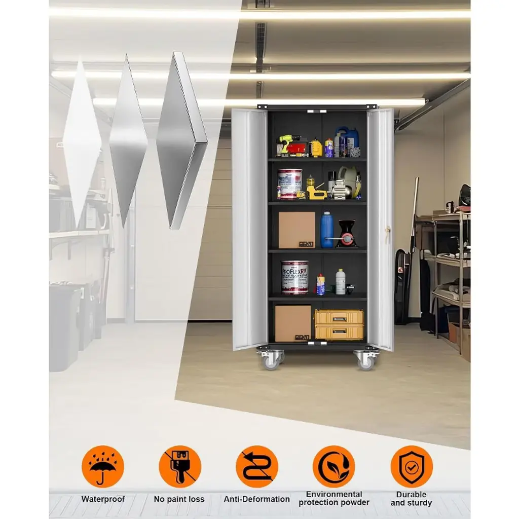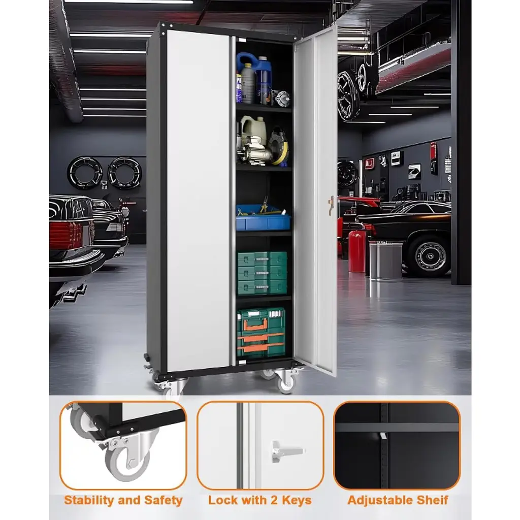 This heavy-duty 72-inch steel cabinet offers robust storage with reinforced construction supporting 120 pounds per shelf. Eco-friendly powder coating resists scratches and rust for lasting durability. Magnetic doors ensure secure closure during frequent access in workshops or garages. Adjustable shelves accommodate varied item sizes, while lockable wheels provide smooth 360° mobility and stationary stability. Dual-key security protects contents from unauthorized access, ideal for child-sensitive items. Detachable structure assembles easily with included instructions, featuring 180° swing doors. Combines industrial resilience, customizable organization, and effortless mobility for household or garage storage needs without compromising security or accessibility.