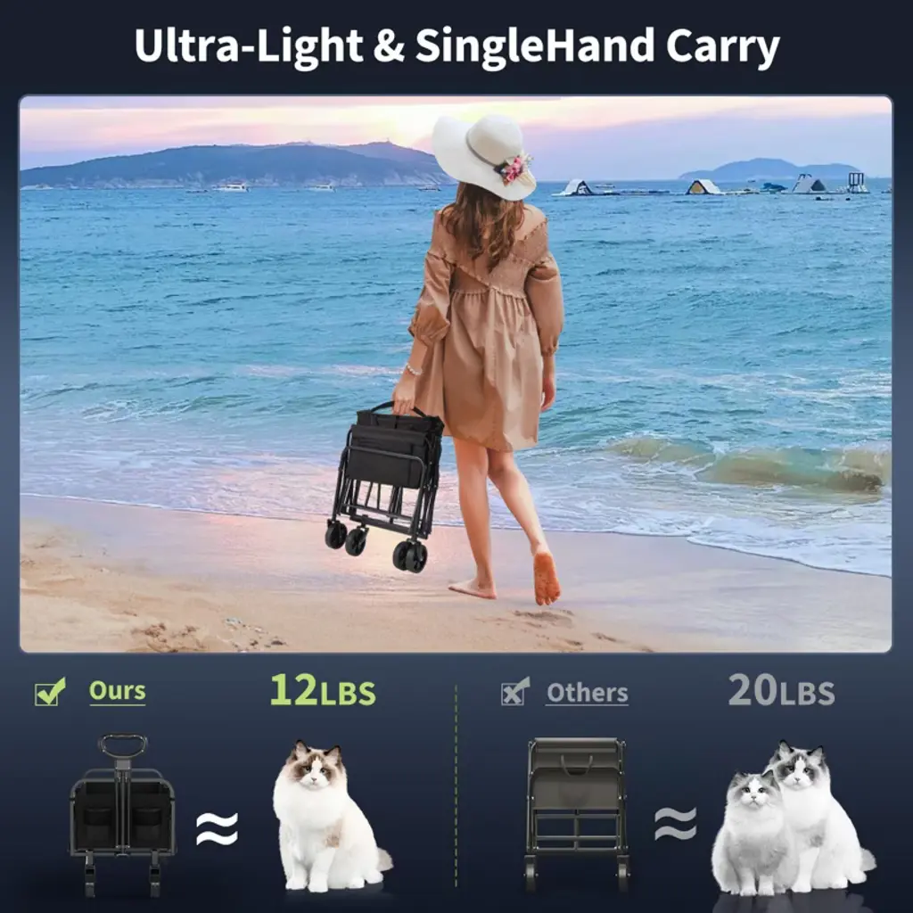 This heavy-duty utility wagon supports 380 lbs for transporting groceries, camping gear, or garden supplies effortlessly. Features a collapsible frame for compact storage and all-terrain wheels that glide smoothly on sand, gravel, or pavement. The adjustable handle ensures ergonomic pulling comfort, while integrated drink holders add convenience during outings. Merges robust load capacity with versatile functionality—equally effective as a beach cart, shopping hauler, or garden transporter. Combines rugged durability, adaptable mobility, and user-focused design for seamless multi-surface use through purely mechanical engineering.