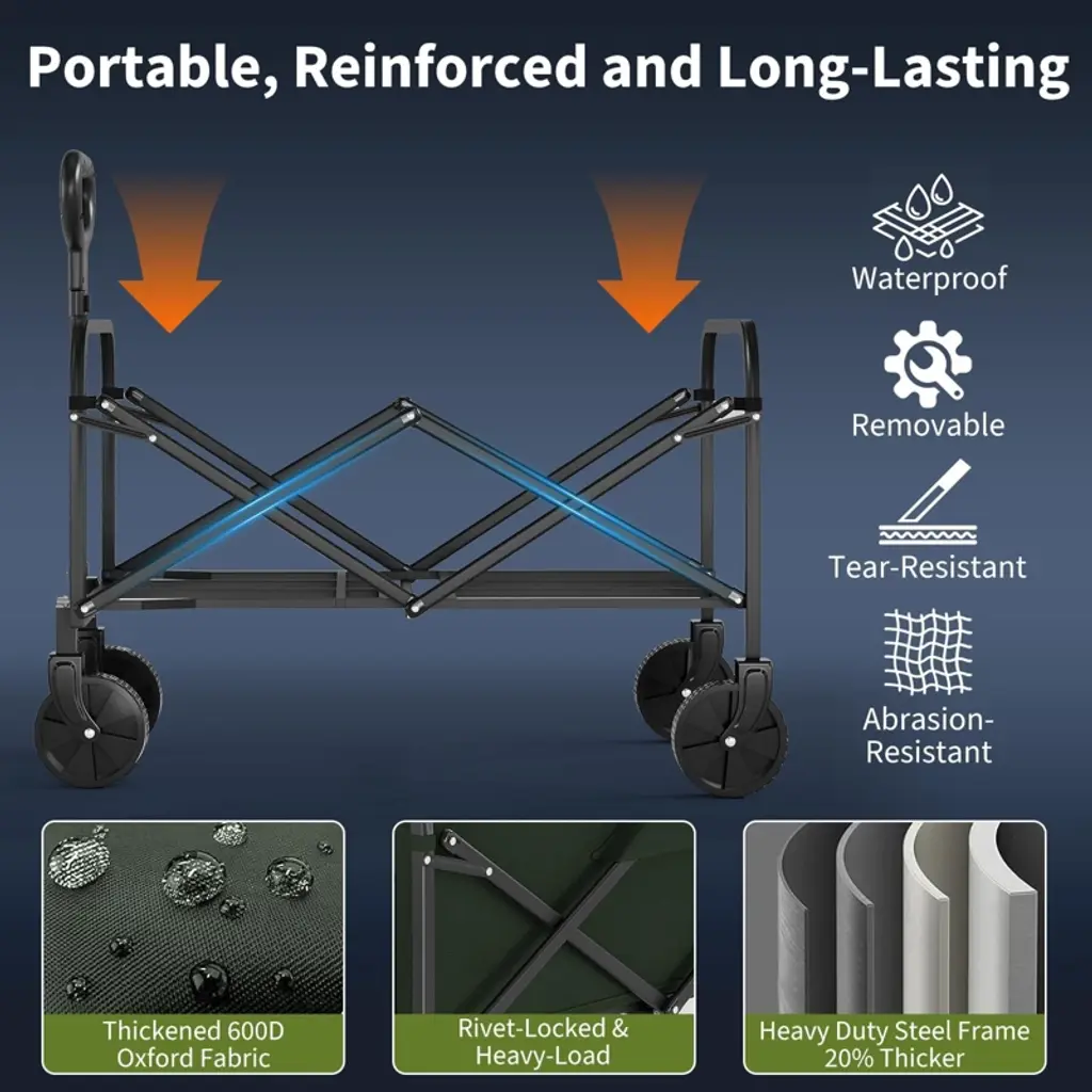 Gustowave Collapsible Utility Wagon Cart 220 L Large Capacity, 380lbs Load, Steel Frame All Terrain Wheels, Adjustable Handle, Green