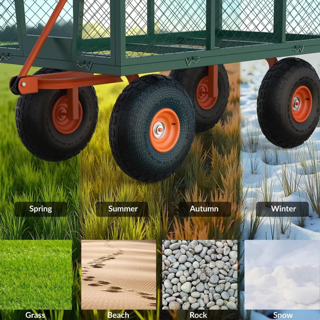 This heavy-duty garden wagon is designed to handle loads up to 500 lbs with an extra-deep 8-inch steel bed, making it easy to transport soil, plants, and gardening tools. Built from powder-coated, rust-resistant steel with reinforced hinges, it stands up to all weather conditions for long-term durability. Equipped with smooth-rolling, airless 10" all-terrain wheels, it glides effortlessly over mud, grass, gravel, and slopes. The 180° swivel handle with ergonomic rubber grips allows for precise, one-handed maneuvering in tight spaces. Additionally, the wagon’s 3-in-1 convertible design lets you switch between mesh sides, an open flatbed, or a compact folded mode for easy storage.