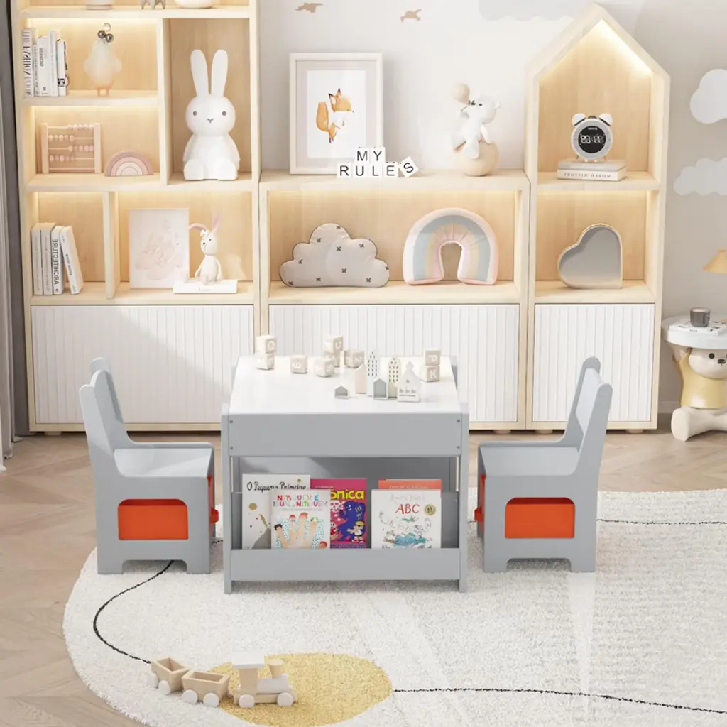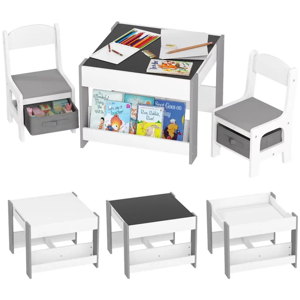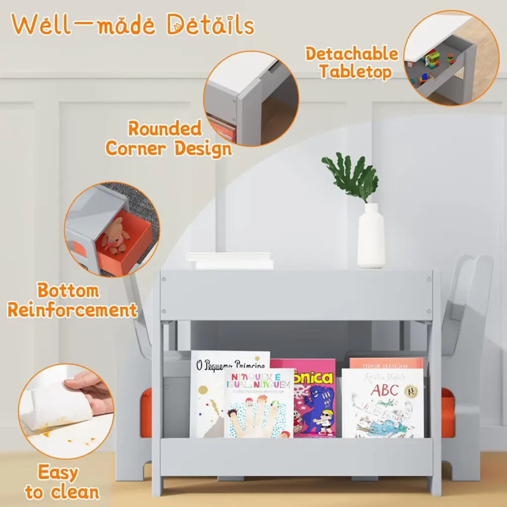 This 3-in-1 kids’ art table and chair set offers a versatile space for drawing, building, reading, and learning, encouraging creativity through multiple activities. Its detachable, reversible tabletop features an erasable graffiti surface and reveals a spacious storage compartment underneath. The set also includes chairs with removable fabric drawers and built-in bookshelves for convenient organization. Made from child-safe materials with rounded edges, the sturdy design ensures safety and durability. Easy to assemble with included instructions and accessories, it’s perfect for playrooms, classrooms, or daycares.