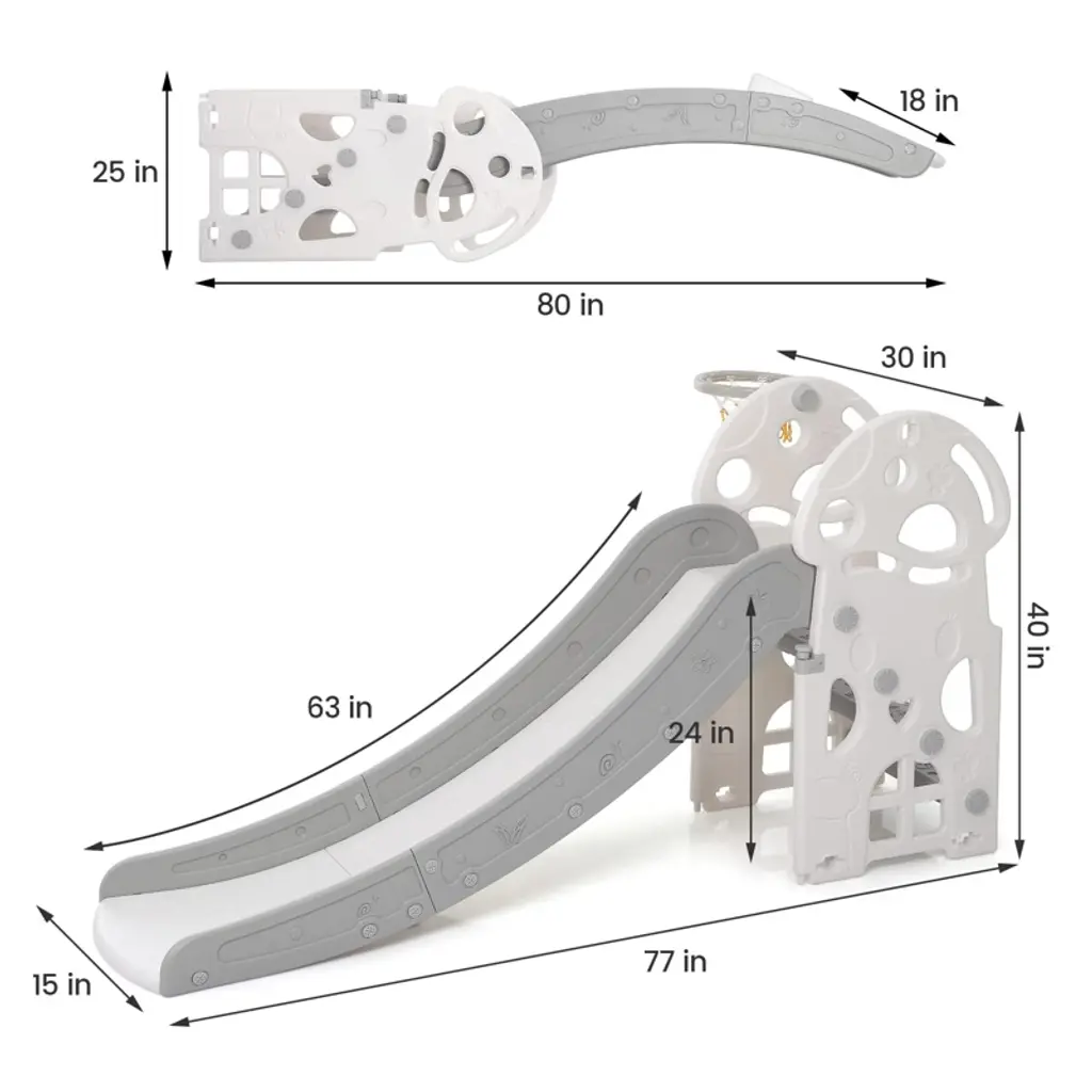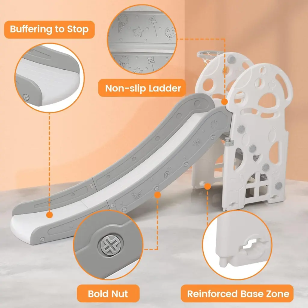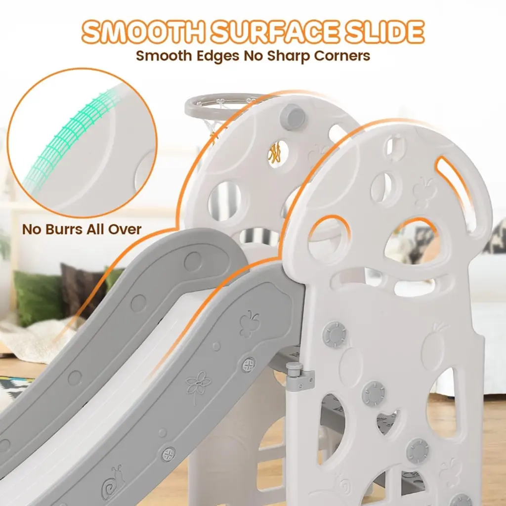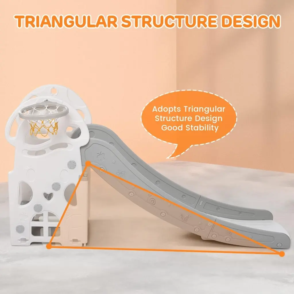 This toddler slide offers a safe, smooth, and multi-functional play experience designed for children aged 1 to 6. Made from non-toxic HDPE material with a sturdy triangular structure, it supports up to 100 pounds and features safety-enhanced handrails and steps. The slide includes an extended, ergonomically designed sliding surface to protect toddlers during play, plus a built-in basketball hoop for added fun. Easy to assemble and space-saving with a foldable design, it’s perfect for active little ones and convenient for parents.