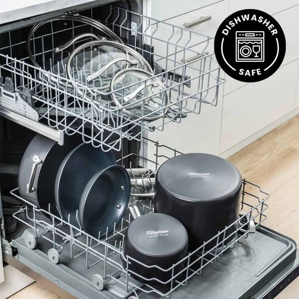 Laser Titanium hard anodized cookware features a new patent-pending technology with a safe non-toxic cooking surface without potentially harmful chemicals (PFAS, PTFE, PFOA). The cookware is non-stick, 3 times harder than stainless steel, safe for metal utensils and is oven safe up to 500°F.