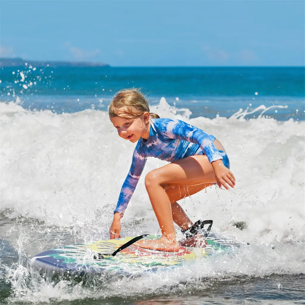 Experience stability and ease with this body board designed with well-made details for an enjoyable surfing experience. The crescent tail provides excellent wave face grip, while the 60/40 rail and dual bottom channels enhance balance, responsiveness, and speed in various wave conditions. Lightweight and portable, this bodyboard offers quick water fun without the need for inflation. This bodyboard features a comfortable and impact-resistant XPE deck, a strong and lightweight EPS core, and a high-speed smooth HDPE bottom for durability and performance. Included with this surfboard is a wrist leash that is adjustable for all wrist sizes, essential for keeping your board close and preventing loss in the ocean.Features:Designed with 60/40 rail and crescent tail to boost speed and control Constructed with a HDPE bottom and dual bottom channels Equipped with a comfy and impact resistant XPE deckColor: Multi-color Material: XPE + EPS + HDPE Board Length: 33'' Board Width: 18'' Board Thickness: 2'' Board Weight: 1.3 lbs Rider Weight: up to 130 lbs Rider Height: 45'' Rider Age: 6-10 years old Package Includes: 1 x Body Board 1 x Wrist Leash