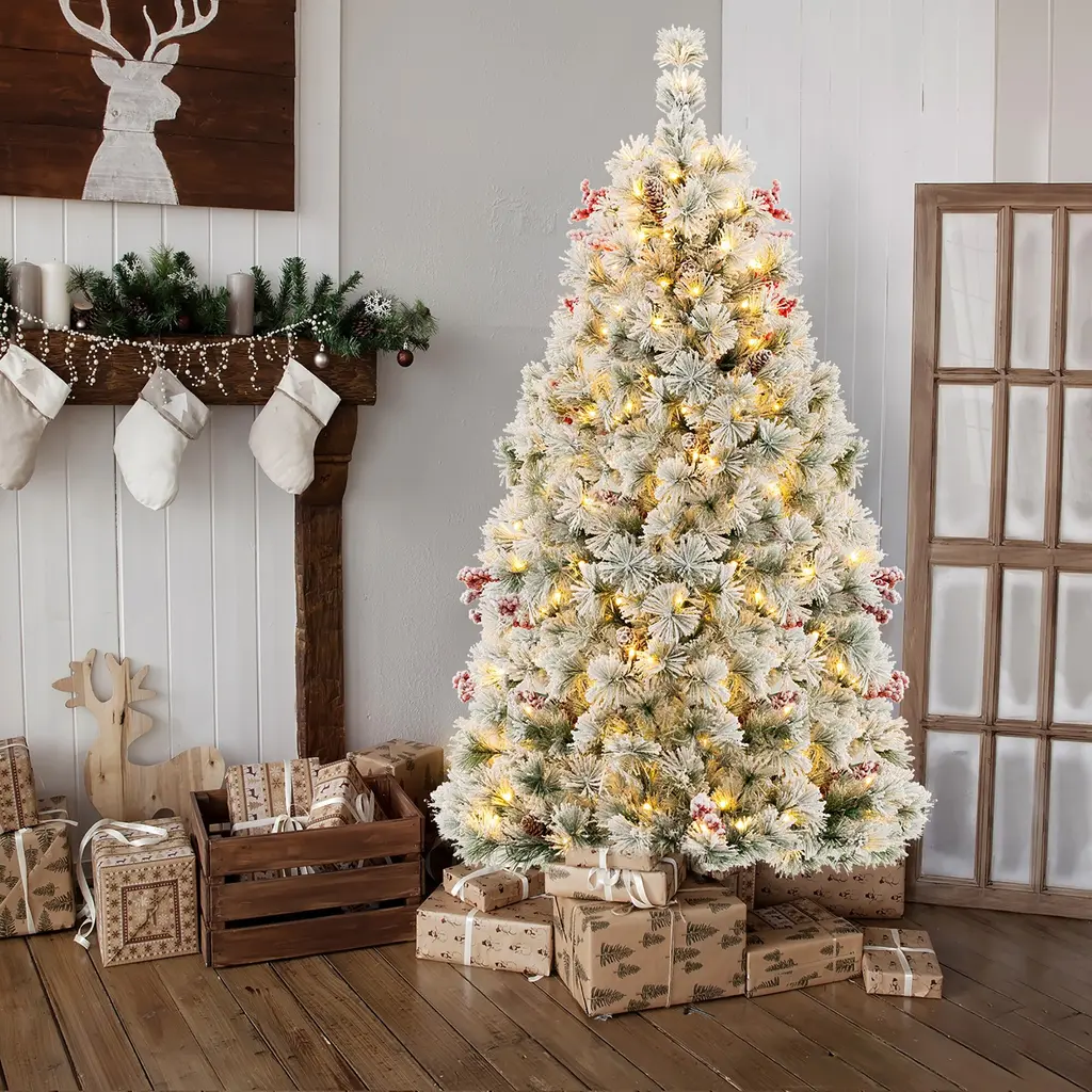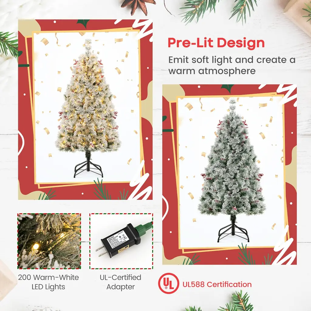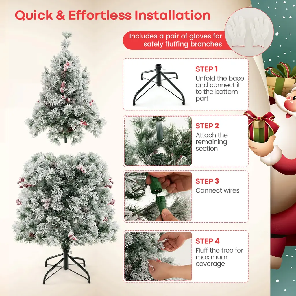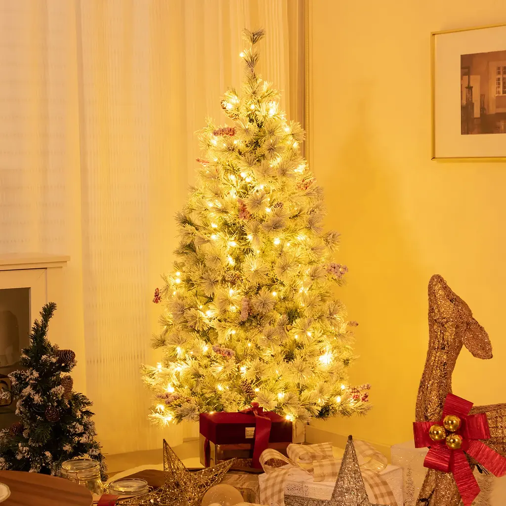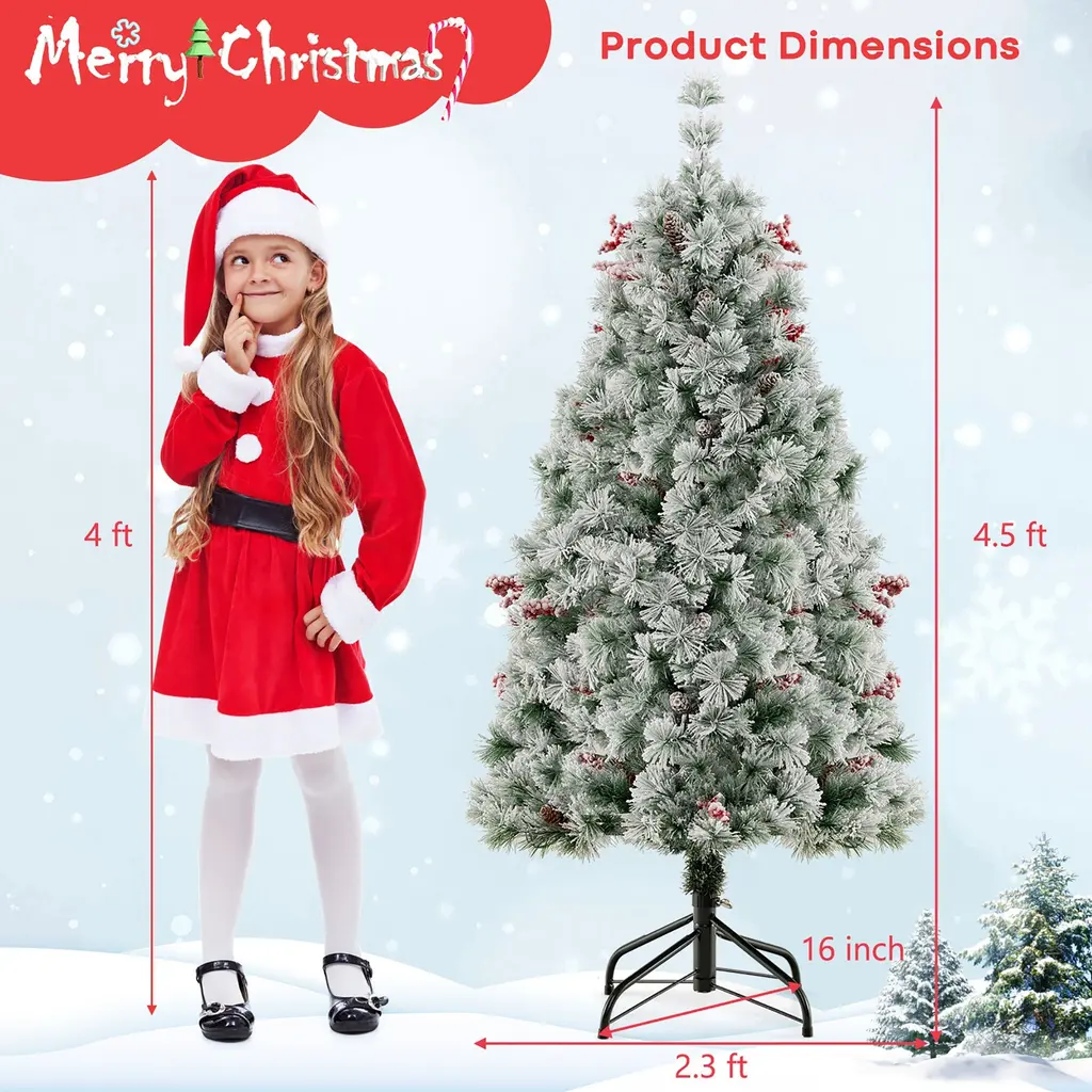 Add a Touch of Elegance and Charm to Your Holiday Season! Our 4.5 ft pre-lit artificial Christmas tree is designed with 251 snow-flocked branch tips, offering a visually impressive display. And with the addition of snowy red berries and snowy pine cones, it creates a lifelike and picturesque scene that captures the enchantment of a winter wonderland. Besides, designed with 200 warm-white LED lights, our lighted Christmas tree bathes your space in a soft and cozy glow. Other than that, it adopts fire-resistant pine needles and a stable crossed metal base, ensuring both safety and durability.Features:Includes a pair of gloves for safely fluffing branches The 200 bright LED lights emit soft light and create a warm atmosphere The metal base with anti-slip footpads protects your floor from scratchingColor: Green & White Material: Pine Needles, Flocking, Metal Tree Height: 4.5 ft Tree Width: 2.3 ft Diameter of Stand: 16'' Number of Sections: 2 Number of Branch Tips: 251 Number of LED Lights: 200 Number of Pine Cones: 20 Number of Red Berries (Clusters): 20 Net Weight: 9 lbs Package Includes: 1 x Christmas Tree 1 x Pair of Gloves 1 x User Guide