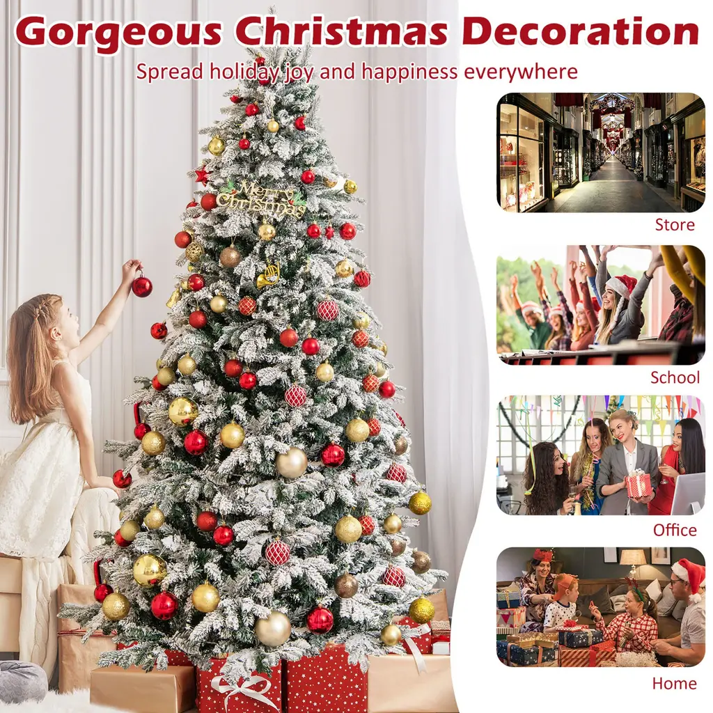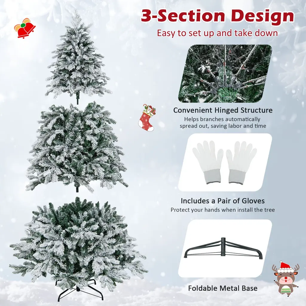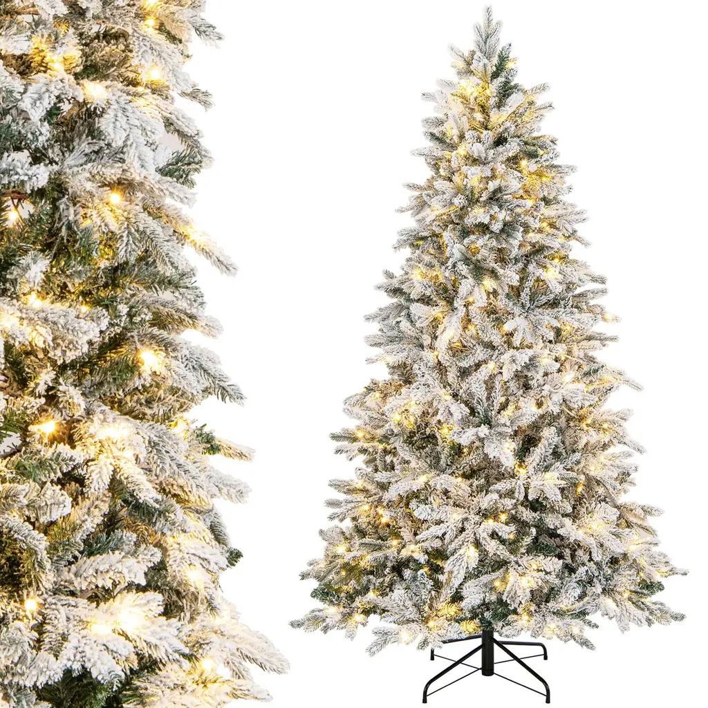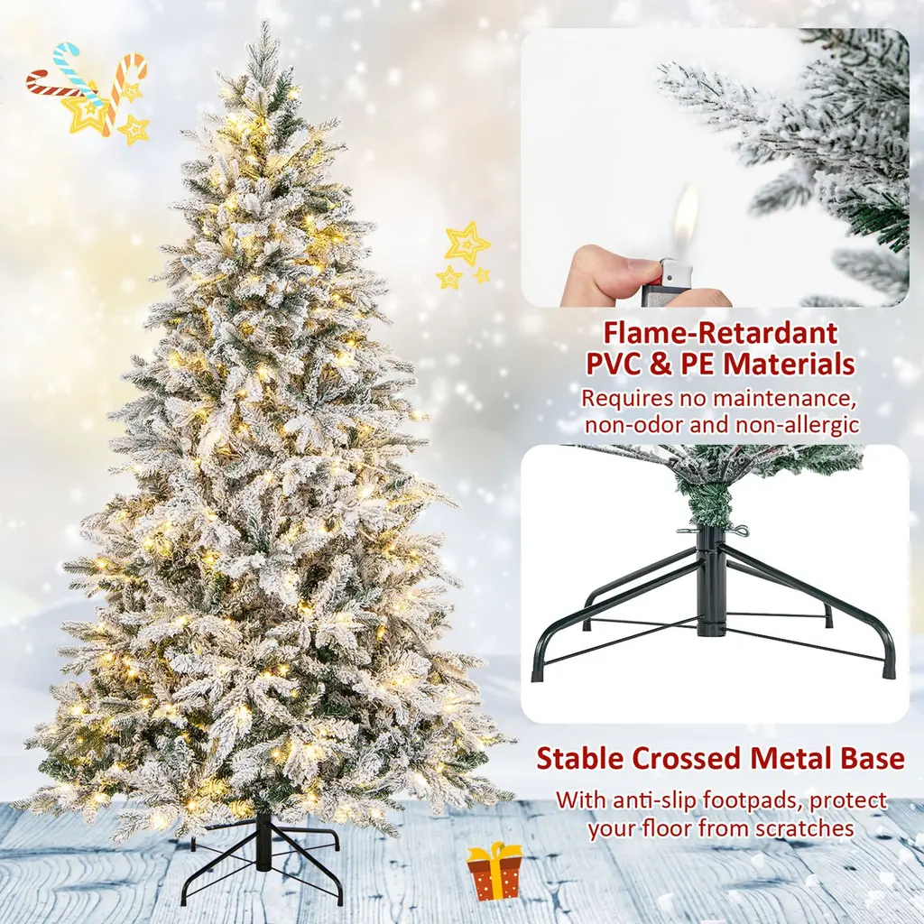 May the Christmas Tree Spread Joy & Happiness Everywhere! Our 4.5/6/7 ft pre-lit artificial Christmas tree is the perfect addition to your holiday decorations. With its 757/1415/1687 snow-flocked branch tips, this tree will create a beautiful winter wonderland in any space. And there exist 2 types of leaves with different textures, creating a luxurious and vivid appearance. Moreover, it comes with 120/260/300 bright LED lights that emit warm-white lighting, creating a warm and joyful festival atmosphere for the Christmas holiday. And safety is always a top priority, which is why our tree is made from fire-resistant PVC and PE materials, ensuring peace of mind during the holiday season.Features:Designed with 2 types of leaves with different textures and shapes, look realistic The snowy flocked design adds a touch of winter wonderland charm to your tree The foldable metal base for space-saving storageColor: Green, White Material: PE, PVC, Flocking, Metal Tree Height: 4.5ft / 6 ft / 7ft Tree Width: 3ft / 3.5ft / 3.8ft Size of Metal Stand: 16'' / 20'' / 22'' Number of Sections: 2 / 3 / 3 Number of Branch Tips: 757 / 1415 / 1687 Number of LED Lights: 120 / 260 / 300 Net Weight: 9 lbs / 18.5 lbs / 25.5 lbs Package Includes: 1 x Artificial Xmas Tree 1 x Pair of Gloves(for 6/7 ft only) 1 x User Guide