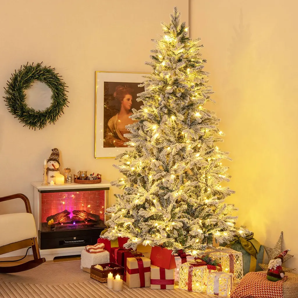 Gymax 4.5/6/7 Ft Pre-Lit Artificial Christmas Tree Snow Flocked Hinged - 7 Foot