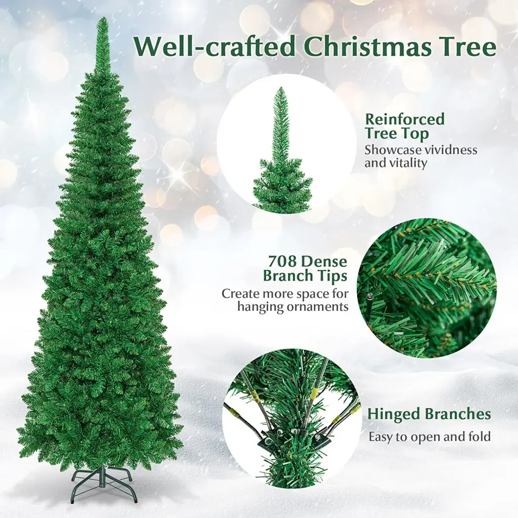 Christmas opens hope and wishes good things in pairs. Our snow flocked pencil tree features slim pencil design, which is great for display in corners, small rooms and areas with limited floor space. The tree is made of fade and crush resistant PVC needles, appears fresh-cut. In addition, it equipped with plenty of branches with thick leaves, and you could adjust them flexibly through turning the hinge connected with the tube. What's more, you could add more ornaments on the tree as you want. High density metal bases to keep the tree planted in an upright position. Wishing you a merry Christmas and great happiness!Features:Create more cheerful atmosphere for Christmas day Slim pencil design great for display in narrow space Dense PVC needles providing it with a fresh cut look Sturdy iron base provides the tree greater supportMaterial: PVC + Metal Net Weight: 4.5 lbs Height: 4.5 FT Overall Dimension: 4.5'(H) x 1.8'(W) Number of Tips: 242 Package includes: 1 X Pencil Christmas Tree