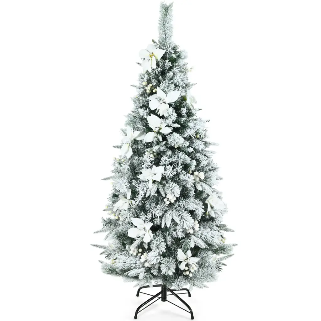 Bring hope and happiness this Christmas! With great durability and natural-looking, the hinged Christmas tree can be your Christmas must-have.Delicately crafted with 339 / 471 / 627 / 807 branch tips, the evergreen tree looks super genuine. Pre-decorated with pure white berries and lily-white flowers, the pencil tree will be a big hit and draw great attention. The Xmas tree is equipped with a premium foldable metal stand, which not only provides strong support and great stability but also protects your floor from scratching. And it is very convenient to install because of the hinged branches. They quickly fold up or down for assembly or storage. You will get a perfect Christmas tree to warm your holiday!Features:Pure white berries and lily-white flowers create an elegant and luxurious look Snow flocking creates a unique feeling of snowing winter Flourish branches bring a lifelike appearanceColor: White Material: PVC + PE + Metal Height: 5 / 6 / 7 / 8FT Net Weight: 9.5 / 13 / 16 / 21.5 lbs Number of Tips: 339 / 471 / 627 / 807 Package includes: 1 X Snow Flocked Christmas Tree 1 X Stand