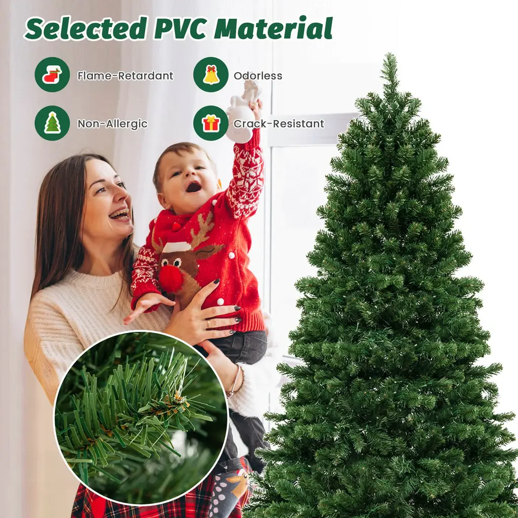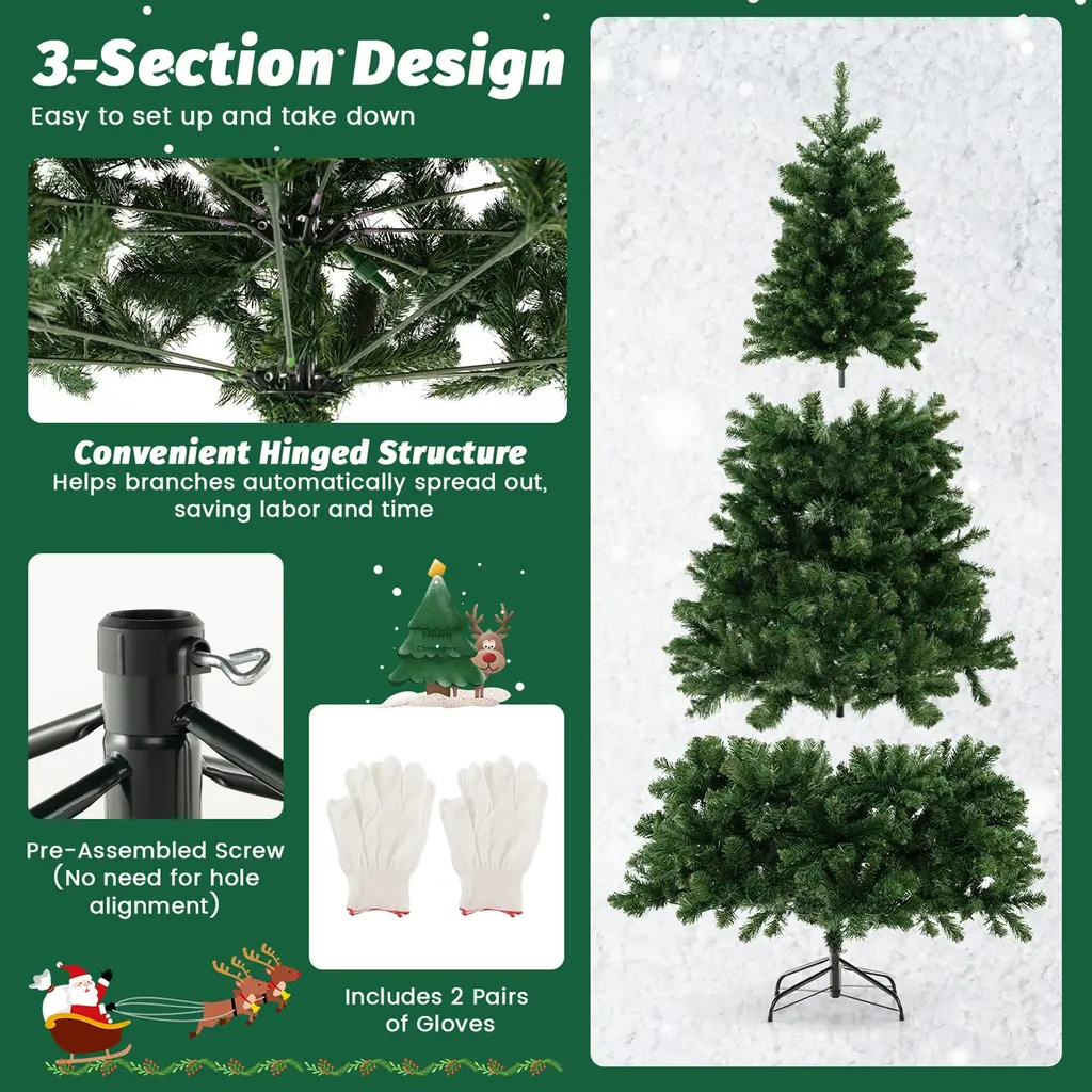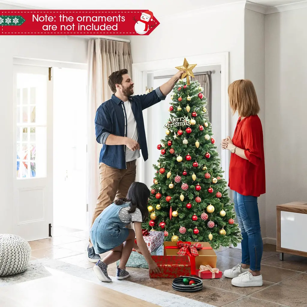 Wish You a Happy & Warm Festive Time! Our luxurious pre-lit artificial Christmas tree can be a perfect choice for adding a touch of magic to your holiday season. With its 821/1188/1498 dense branch tips, our tree offers a visually impressive display, creating a lush and vibrant backdrop for your holiday decorations. Whether placed in your living room, office, or any other space, it effortlessly enhances the festive ambiance and brings a sense of joy and warmth to the surroundings. Moreover, equipped with 560/700/880 warm-white LED lights, the tree can also bring festive brilliance to your home.Features:The PVC leaves are flame-retardant, non-odor, non-allergic, and Sturdy Includes 2 pairs of gloves for protecting your hands when installing the tree Features 821/1188/1498 dense branch tips, look realistic and vivid from far to nearColor: Green Material: PVC, Metal Tree Height: 6 / 7 /8 ft Tree Width: 3.4 / 4 / 4.6 ft Diameter of Stand: 22'' Number of Sections: 3 Number of Branch Tips: 821 / 1188 /1498 Number of LED Lights: 560 / 700 / 880 Net Weight: 18 / 25.5 / 34.5 lbs Package Includes: 1 x Christmas Tree 2 x Pairs of Gloves 1 x User Guide