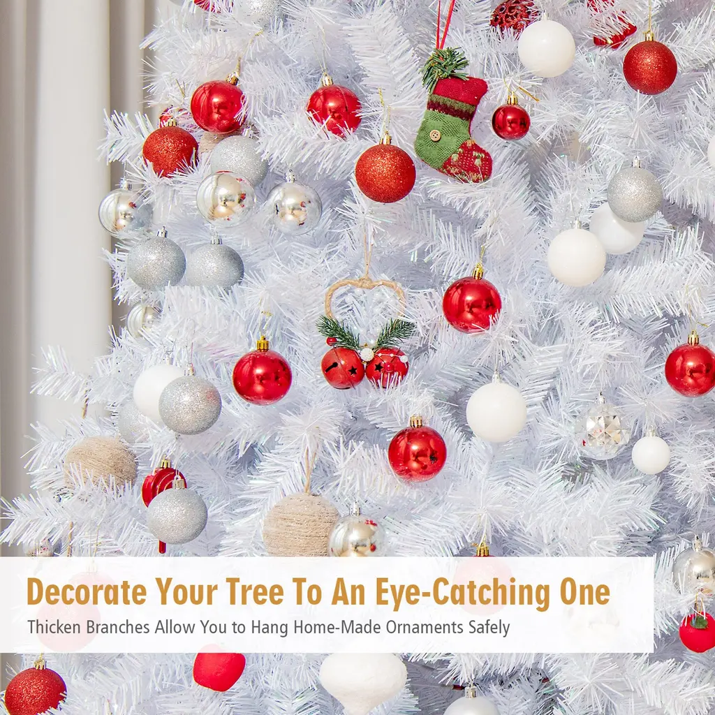 Our white Christmas tree creates strong festive atmosphere during Christmas season. This hinged artificial tree comes with 792 / 1156 / 1636 white branch tips, showcasing lush and leafy appearance. Made of premium PVC and PET material, the leaves have realistic look and iridescent glitter, making the tree glorious and outstanding. Since its hinged structure, this white unlit Xmas tree is easy to assemble and fluff. And supported by enhanced metal stand, the tree ensures high stability and upright position. Also, the folding design of base facilitates storage when the Christmas is over. All in all, our white Christmas tree spreads joy and happiness to all occasions for better festival celebration.Features:Premium PVC & PET materials create glittery & realistic appearance Full-bodied tree with 792 / 1156 / 1636 tips brings home festival & natural vibe Brightly whiteiridescent leaves for charming visual attractivenessColor: White Material: PVC, PET, Iron Height: 6ft / 7ft / 8ft Base Width: 3.5ft / 3.9ft / 4.3ft Number of Branch Tips: 792 / 1156 / 1636 Net Weight: 13 lbs / 18 lbs / 24 lbs Package includes: 1 x Christmas Tree 1 x Metal Stand