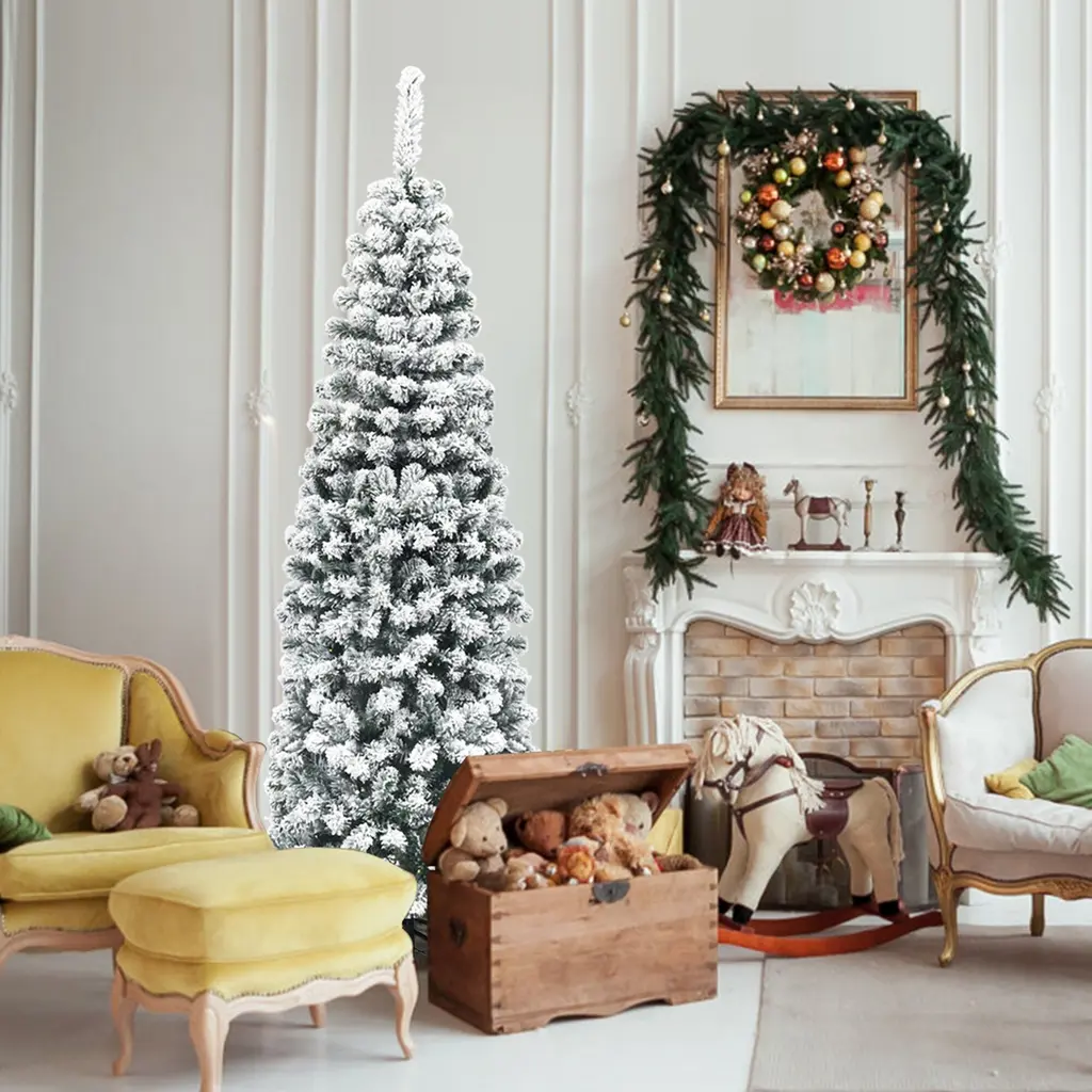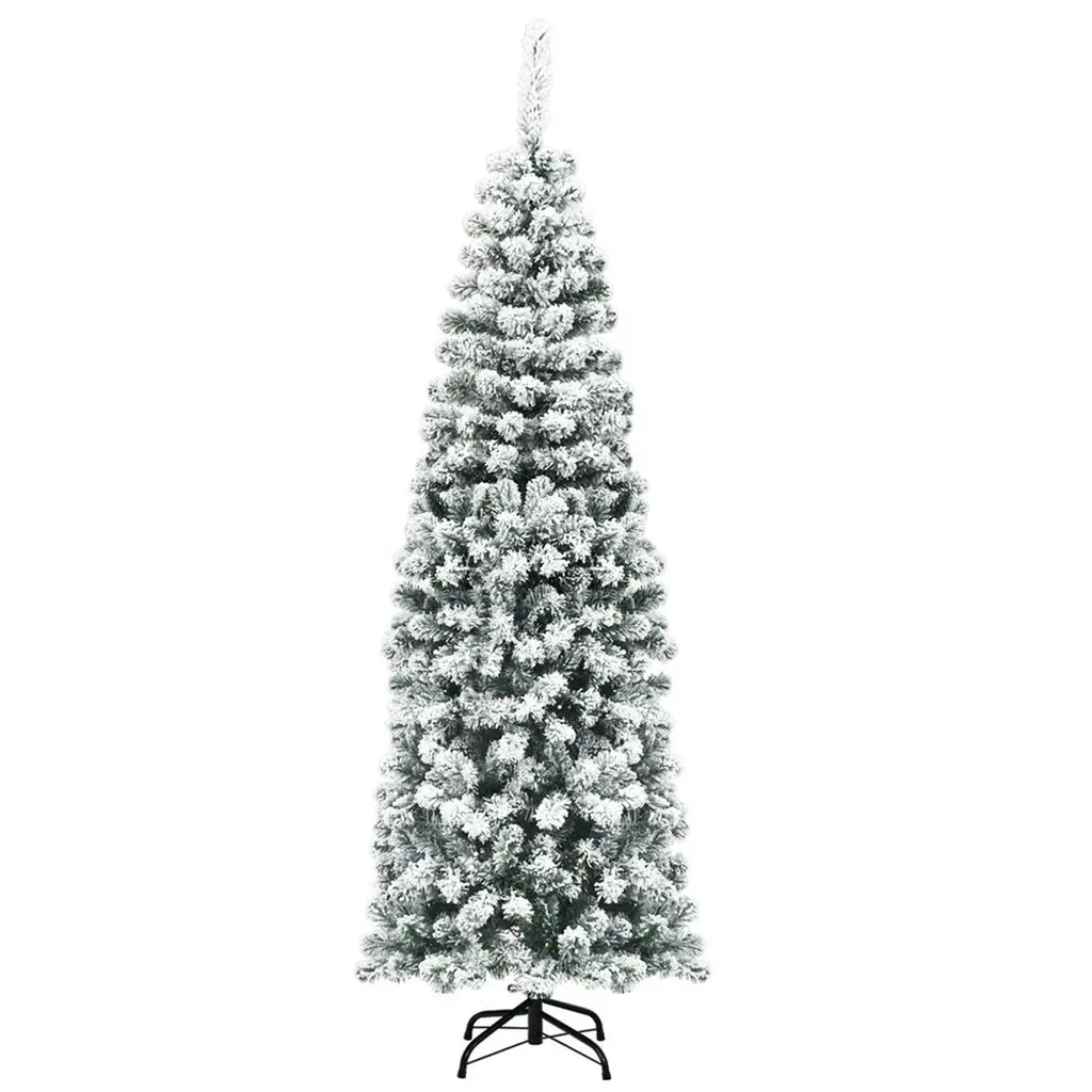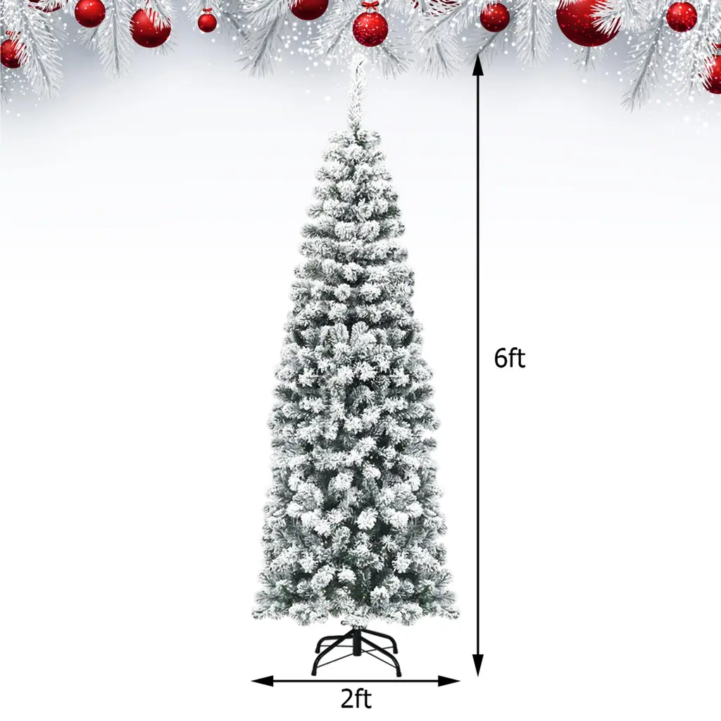 Christmas opens hope and wishes good things in pairs. Our snow flocked pencil tree features slim pencil design, which is great for display in corners, small rooms and areas with limited floor space. The tree is made of fade and crush resistant PVC needles, appears fresh-cut. In addition, it equipped with plenty of branches with thick leaves, and you could adjust them flexibly through turning the hinge connected with the tube. What's more, you could add more ornaments on the tree as you want. High density metal bases to keep the tree planted in an upright position. Wishing you a merry Christmas and great happiness!Features:Create more cheerful atmosphere for Christmas day Slim pencil design great for display in narrow space Dense PVC needles providing it with a fresh cut look Sturdy iron base provides the tree greater supportMaterial: PVC + Metal Net Weight: 7.5 lbs Height: 6FT Overall Dimension: 6'(H) x 2'(W) Number of Tips: 500 Package includes: 1 X Pencil Christmas Tree