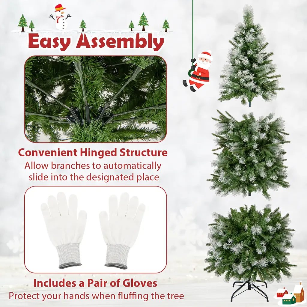 Elevate Your Holiday Decoration and Embody the Spirit of the Season! Our exquisite pre-lit Christmas tree features 820/580 lush branch tips and a mix of flocked pine needles, frosted PE leaves, flocked PVC leaves,?and green PVC leaves, offering a luxurious and realistic appearance that will impress your guests. And the faux leaves are crafted of reliable and flame-retardant PE and PVC, ensuring safety and peace of mind. Moreover, it creates a cozy glow without the hassle of separate string lights. Thanks to the hinged structures that connect branches to the tree trunk, setting up and fluffing the tree is easier than before.Features:Lush branch tips and the flocked design make the tree more vivid, full-bodied, festive Features 4 types of leaves with different shapes and textures, more realistic Pre-strung with bright warm-white LED lights, create a warm and inviting glowColor: Green+White Material: PVC, PE, Metal Overall Dimensions: 2.9 x 7.5 ft/2.6 x 6 ft (Dia. x H) Diameter of the Metal Base: 20/16'' Number of Branch Tips: 820/580 Number of LED Lights: 350/280 Number of Sections: 3 Net Weight: 19/14 lbs Package Includes: 1 x Pre-Lit Christmas Tree 1 x Pair of Gloves 1 x User's Manual