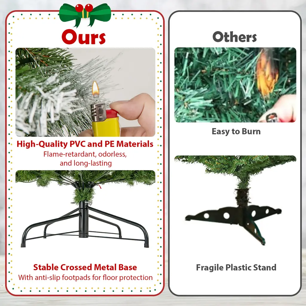 Elevate Your Holiday Decoration and Embody the Spirit of the Season! Our exquisite pre-lit Christmas tree features 820/580 lush branch tips and a mix of flocked pine needles, frosted PE leaves, flocked PVC leaves,?and green PVC leaves, offering a luxurious and realistic appearance that will impress your guests. And the faux leaves are crafted of reliable and flame-retardant PE and PVC, ensuring safety and peace of mind. Moreover, it creates a cozy glow without the hassle of separate string lights. Thanks to the hinged structures that connect branches to the tree trunk, setting up and fluffing the tree is easier than before.Features:Lush branch tips and the flocked design make the tree more vivid, full-bodied, festive Features 4 types of leaves with different shapes and textures, more realistic Pre-strung with bright warm-white LED lights, create a warm and inviting glowColor: Green+White Material: PVC, PE, Metal Overall Dimensions: 2.9 x 7.5 ft/2.6 x 6 ft (Dia. x H) Diameter of the Metal Base: 20/16'' Number of Branch Tips: 820/580 Number of LED Lights: 350/280 Number of Sections: 3 Net Weight: 19/14 lbs Package Includes: 1 x Pre-Lit Christmas Tree 1 x Pair of Gloves 1 x User's Manual
