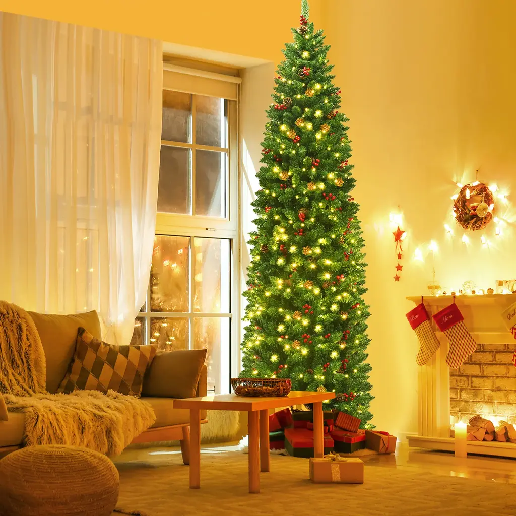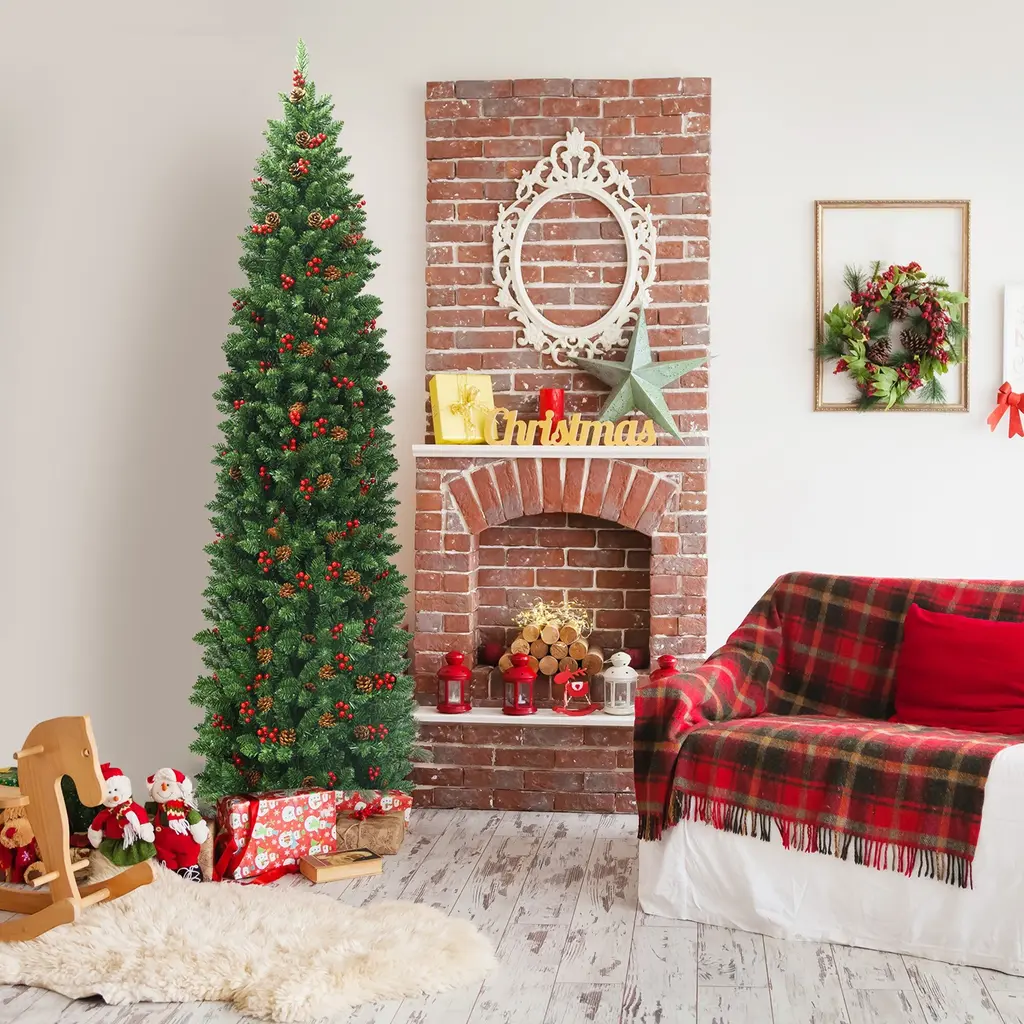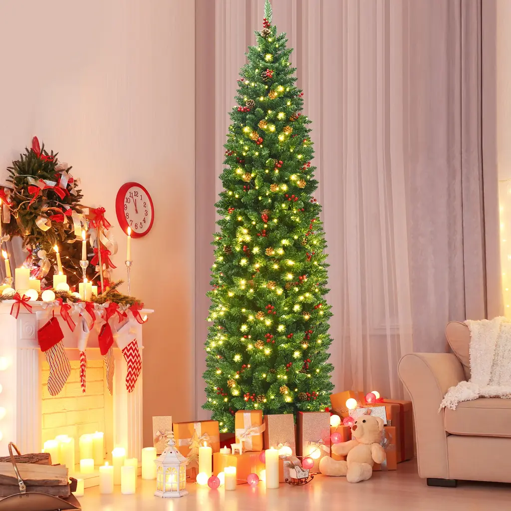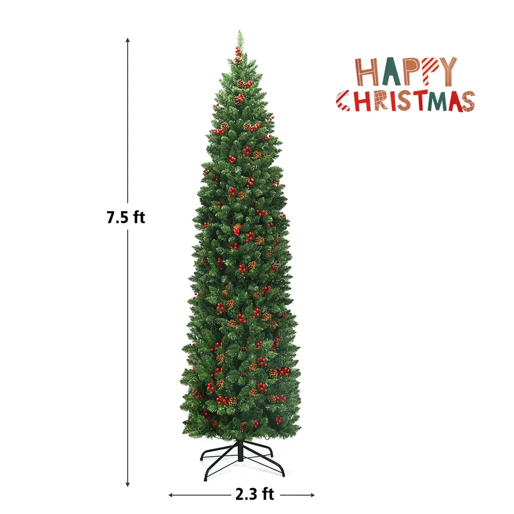 Decorate your home with our pre-lit pencil Christmas tree to embrace the warm festival feeling! This 7.5 ft artificial tree is designed with hinged structure to make the assembly easy. You can feel the coming of the festival quickly. Made of odorless PVC material, the tree is safe and non-flammable for a long lifespan. Sturdy metal stand will offer good support to keep the tree upright. 350 warm white LED lights can save your time to set up electric lines. Moreover, it is equipped with 980 branch tips and 75 groups of pine cones and red berries to offer you a full and realistic look. It features unique slim shape, so you don't worry about it taking up too much space.Features:Slim pencil shape for displaying small spaces and tight corners High-quality PVC material, fire-resistant and non-allergenic Ideal for home, office, mall, school and more UL certified adapter for safe useColor: Green Material: PVC + Iron Overall Dimensions: 2.3' x 7.5'(Dia x H) Stand Diameter: 1.6' Number of Tips: 980 Number of LED: 350 Input Voltage: 120V 60HZ Output Voltage: 30V Electric Current: 0.2A Net Weight: 20.5 lbs Package Includes: 1 x Pre-lit Christmas Tree 1 x Metal Stand