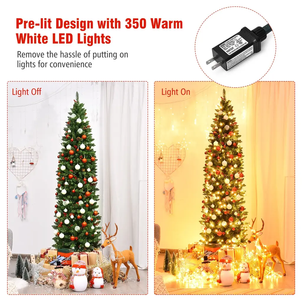 Gymax 7.5ft Pre-Lit Pencil Christmas Tree Hinged Artificial Slim Tree - See Details - Green - 7.5 Foot