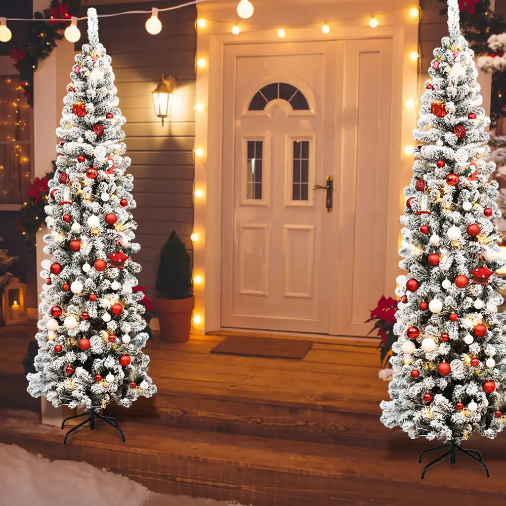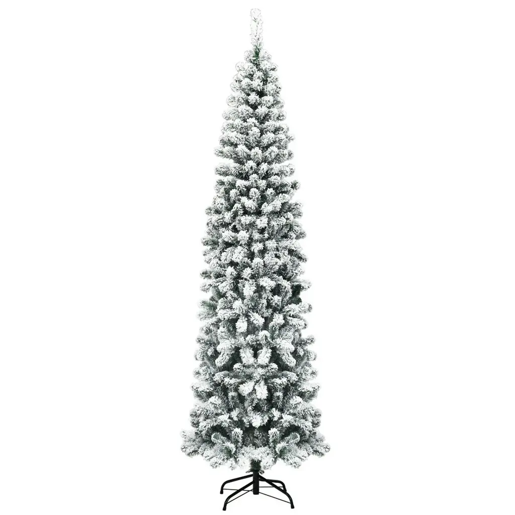Christmas opens hope and wishes good things in pairs. Our snow flocked pencil tree features slim pencil design, which is great for display in corners, small rooms and areas with limited floor space. The tree is made of fade and crush resistant PVC needles, appears fresh-cut. In addition, it equipped with plenty of branches with thick leaves, and you could adjust them flexibly through turning the hinge connected with the tube. What's more, you could add more ornaments on the tree as you want. High density metal bases to keep the tree planted in an upright position. Wishing you a merry Christmas and great happiness!Features:Create more cheerful atmosphere for Christmas day Slim pencil design great for display in narrow space Dense PVC needles providing it with a fresh cut look Sturdy iron base provides the tree greater supportMaterial: PVC + Metal Net Weight: 10.5 lbs Height: 7.5FT Overall Dimension:7.5'(H) x 2.2'(W) Number of Tips: 641 Package includes: 1 X Pencil Christmas Tree