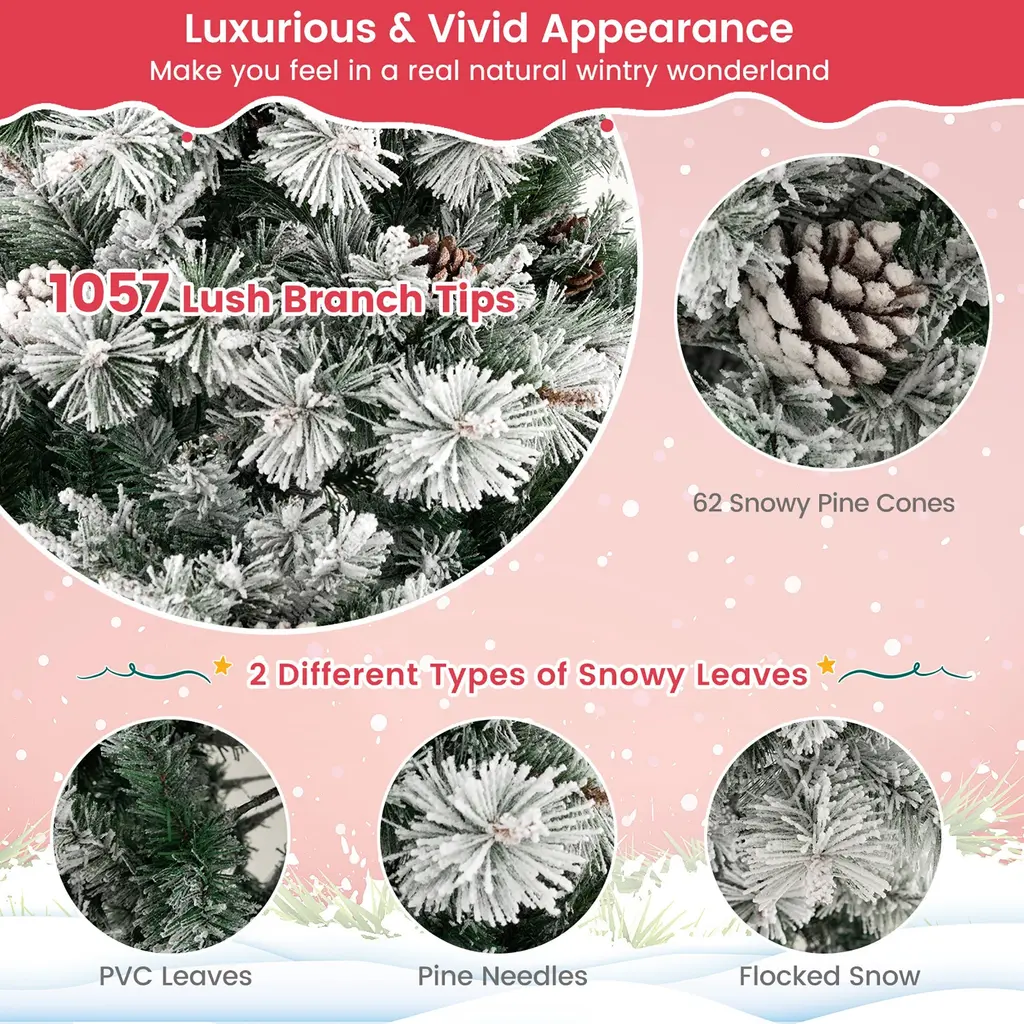 Add a Touch of Elegance and Romance to Your Festive Celebrations! Our 7 ft pre-lit snow-flocked Christmas tree features a unique 3-layer design, and combined with 1057 dense snow-flocked branch tips, exuding a charming and realistic winter appeal. Besides, the tree can not only be an attractive decoration at day time, but also can illuminate your home with its 420 bright LED lights at night time, creating a cozy and enchanting atmosphere. In addition, Safety is always a top priority, which is why this tree is made of flame-retardant PVC material, ensuring peace of mind while enjoying the magic of the season.Features:The bright LED lights emit soft light and create a warm atmosphere With anti-slip footpads, protecting your floor from scratching Features 1057 dense branch tips, look realistic and vivid from far to nearColor: Green & White Material: PVC, Pine Needles, Flocking, Metal Tree Height: 7 ft Tree Width: 3.9 ft Diameter of Stand: 22'' Number of Sections: 3 Number of Branch Tips: 1057 Number of LED Lights: 420 Number of Pine Cones: 62 Net Weight: 27.5 lbs Package Includes: 1 x Christmas Tree 2 x Pairs of Gloves 1 x User Guide
